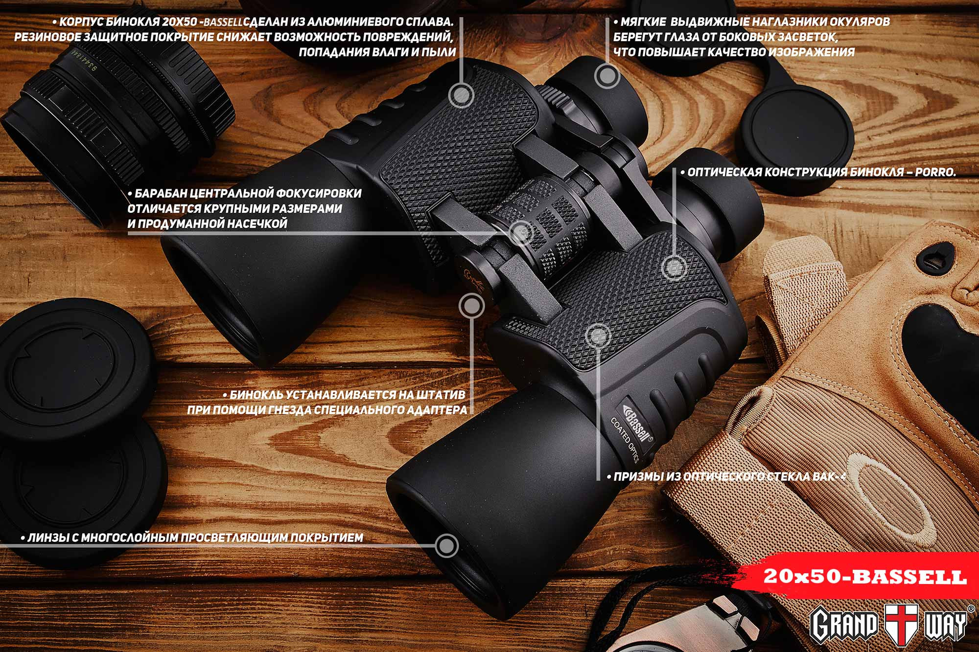 Бинокль 20x50 – BASSELL обладает неизменяемым 20-кратным увеличением и входными линзами диаметром 50 мм.