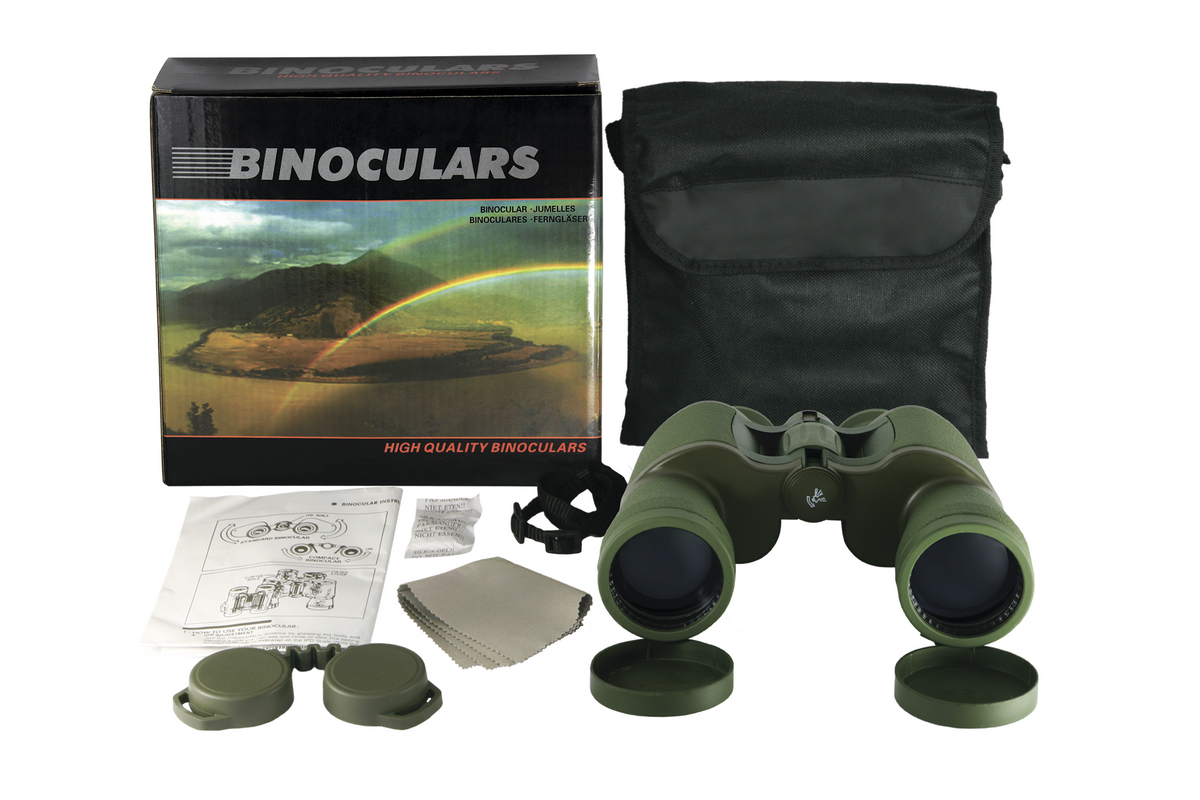 Бинокль Bassell 20x50 укомплектован мягким чехлом-сумкой из черной непромокаемой ткани с ремешком, ремешком для шейного ношения, резиновыми крышками для защиты окуляров и объективов, платком для ухода за оптикой и инструкцией