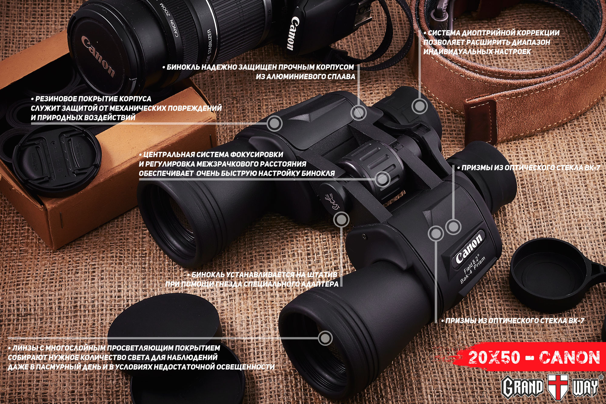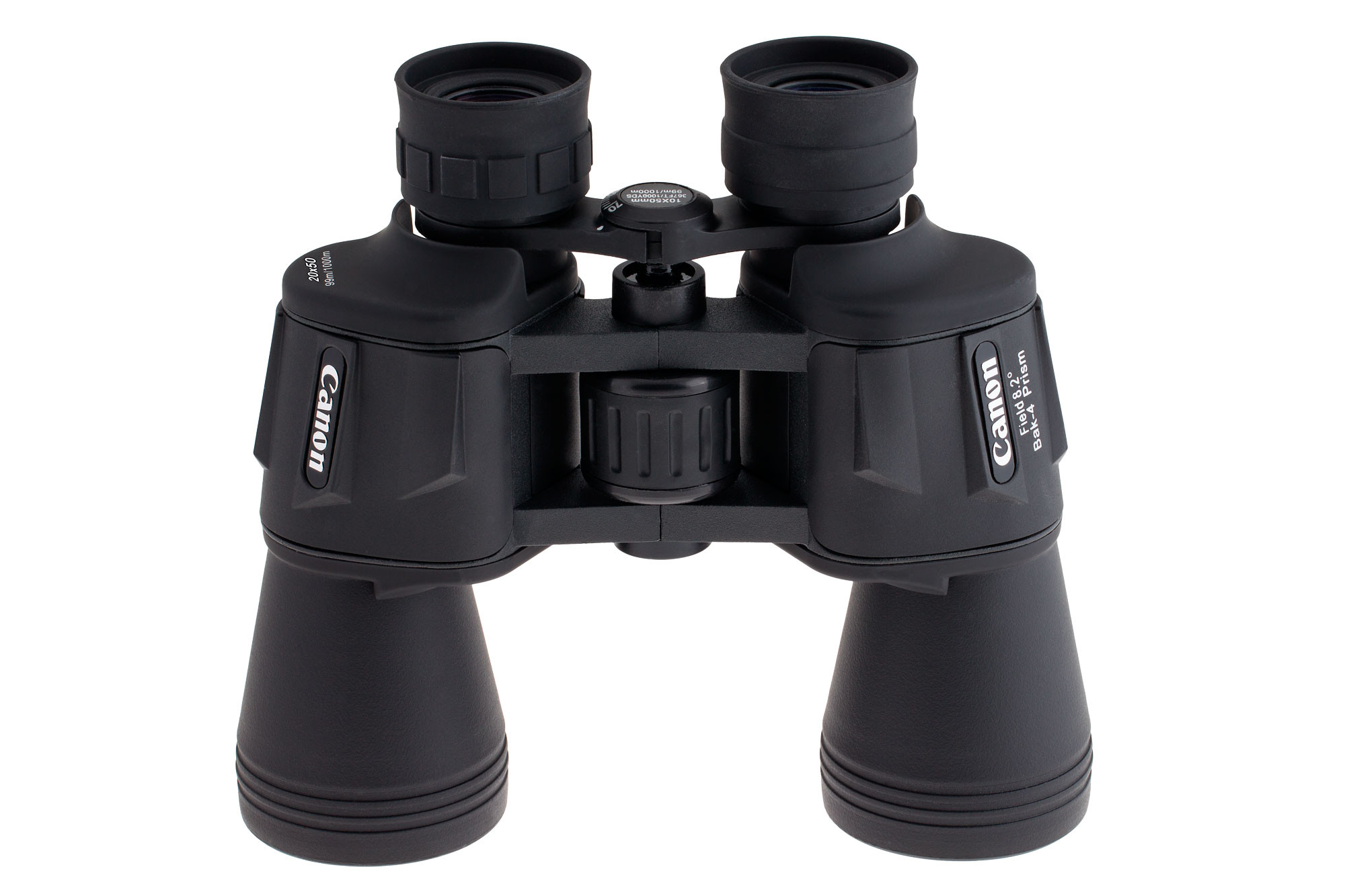 Бинокль Canon 20х50 построен по классической порро – схеме, характерный признак которой – смещение объектива прибора относительно оси окуляра. Такое разнесение оптических каналов позволяет прибору выдавать наблюдателю максимально качественное, яркое изображение. Оптическая начинка прибора включает в себя призмы из оптического стекла ВК-7 и линзы с многослойным просветляющим покрытием. Мощные 50 мм входные линзы бинокля, способны собрать достаточное количества света для наблюдений даже в пасмурный день и условиях недостаточной освещенности.