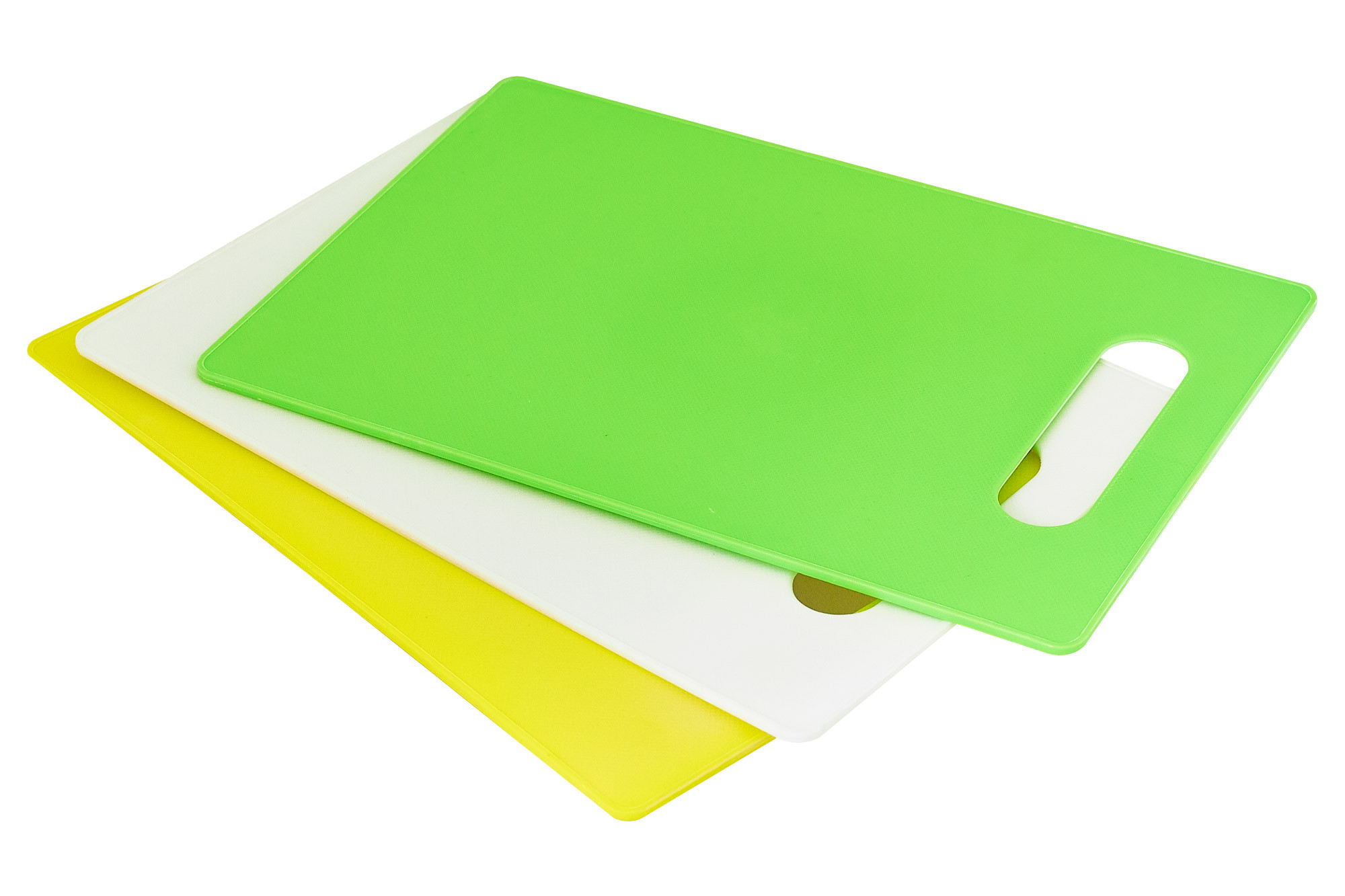 Пластиковые доски изготавливаются в разных вариантах окраски. Мало того, что цвета подбираются приятные глазу, а значит, на кухне сразу становится уютней и веселей. Важным лайфхаком современных поваров является так называемый “цветовой код досок”. Что это такое? Всё очень просто: например, доску красного цвета вы используете для нарезки мяса, жёлтого – для хлеба, зелёного – для зелени и овощей. Теперь вы никогда их не перепутаете! Забудьте про хлеб с запахом рыбы или овощи со вкусом мяса! Больше этого не повторится!