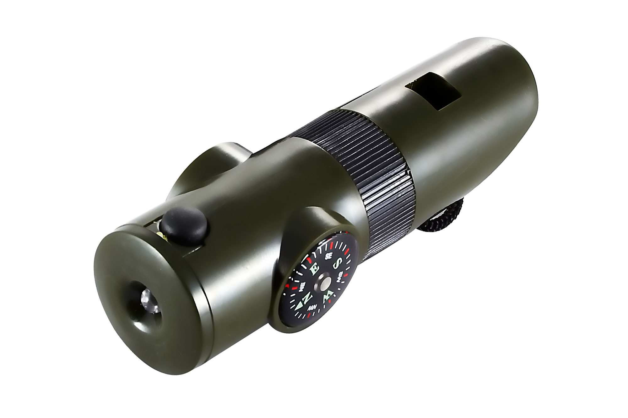 Внутри корпуса спрятаны увеличительная линза и зеркало. При необходимости подать звуковой сигнал - можно воспользоваться свистком, который расположен в торце корпуса. В комлекте с компасом поставляется шнурок.