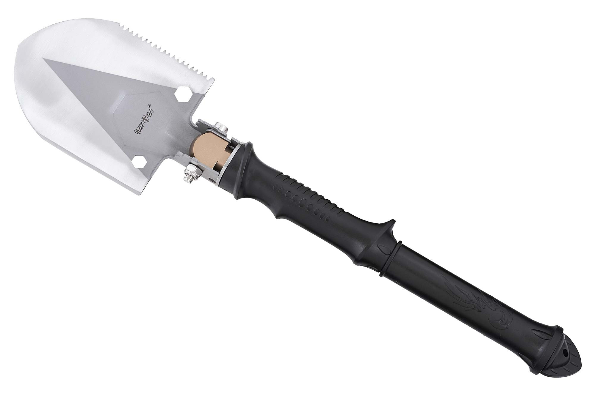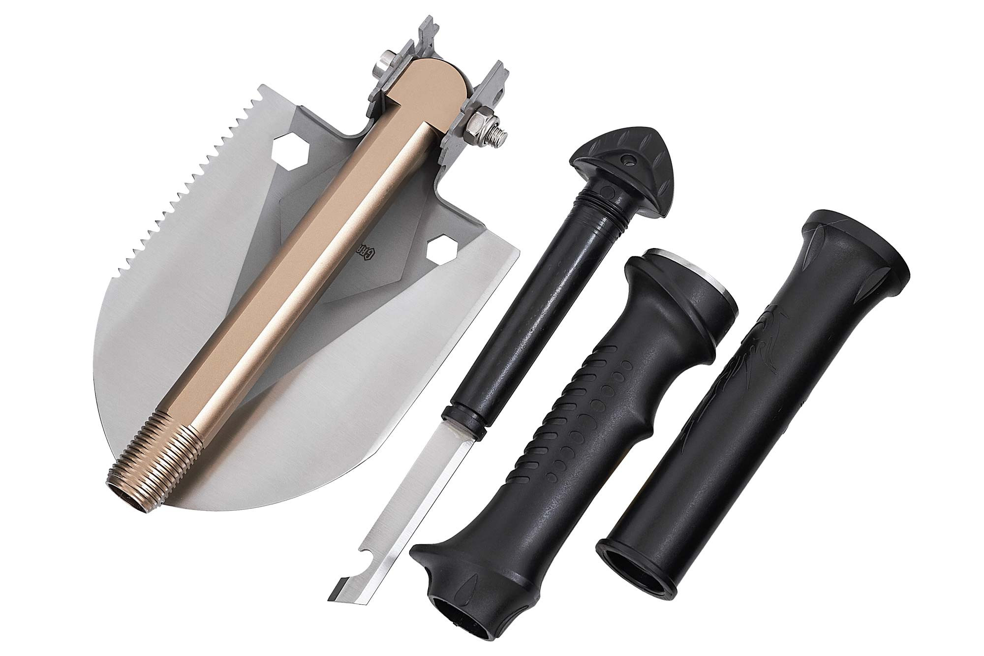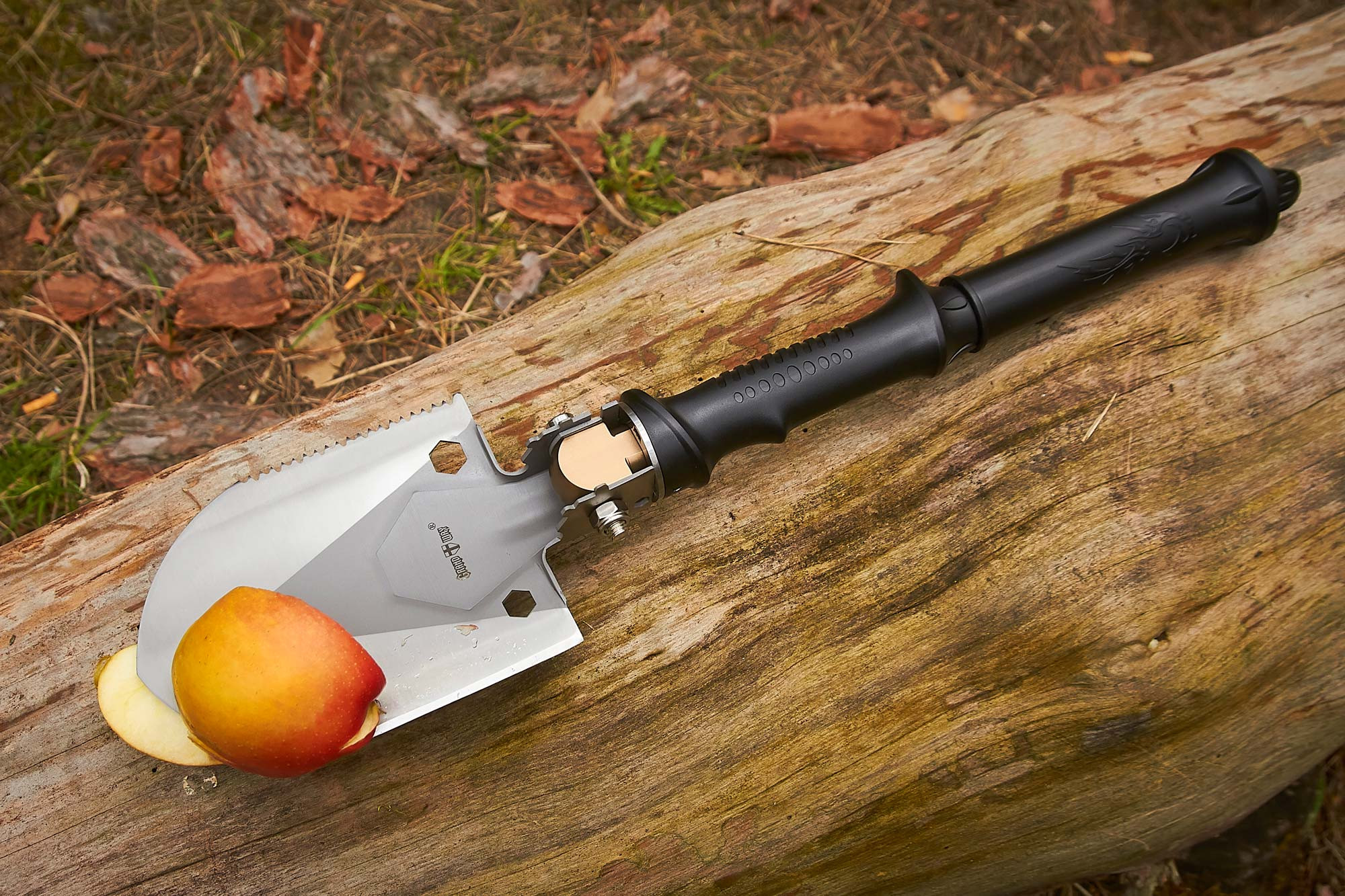 - В полой рукояти лопатки находится нож, который также можно использовать в качестве "открывашки" для бутылок. Нож фиксируется на резьбовом соединении, а потому не выпадет из рукояти даже во время активного использования лопатки по назначению.