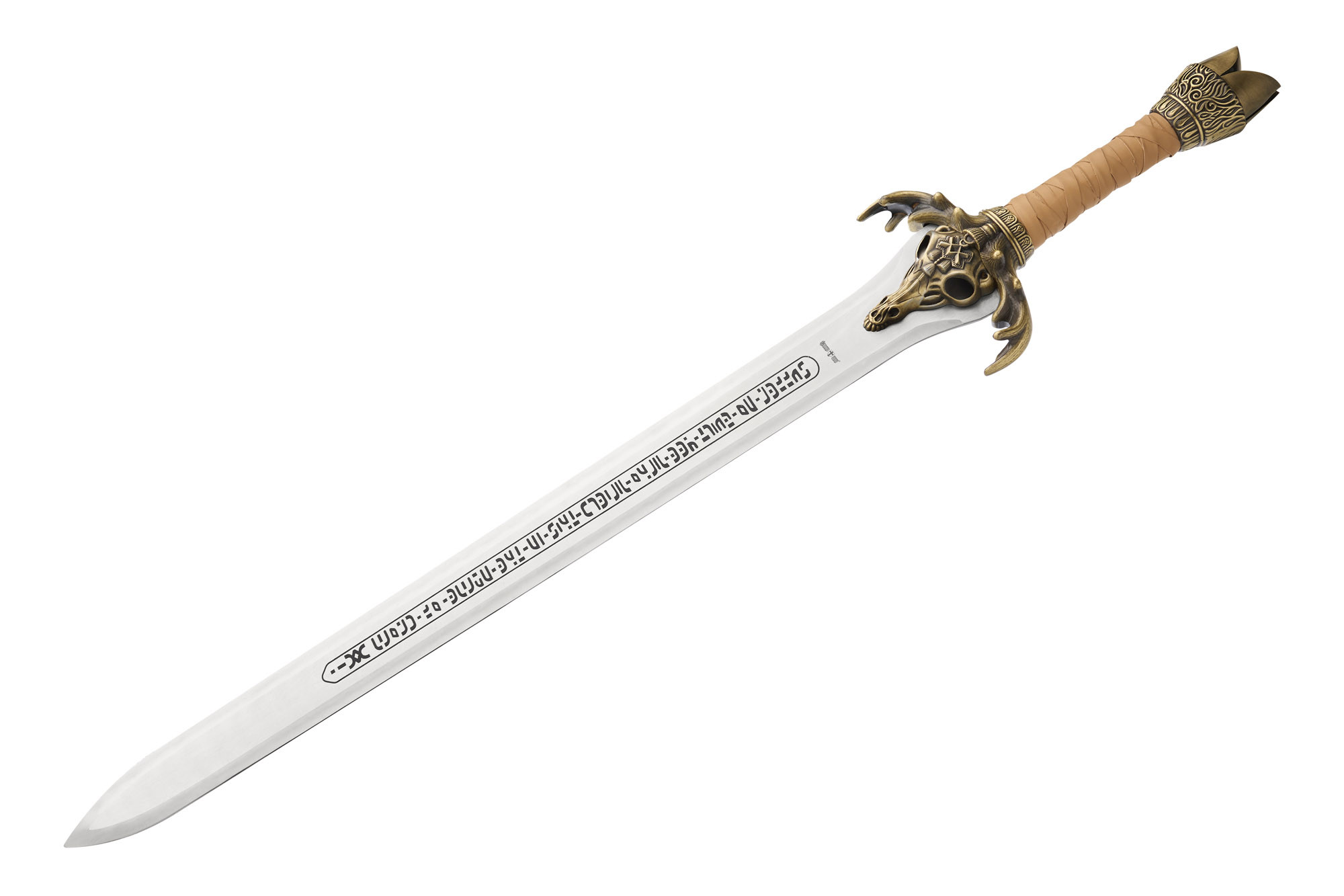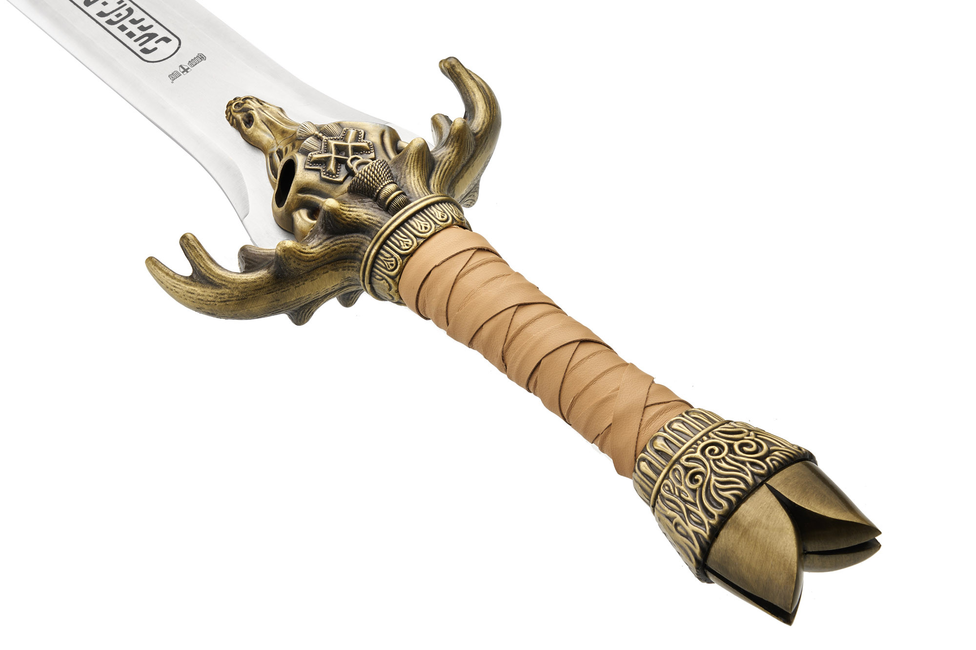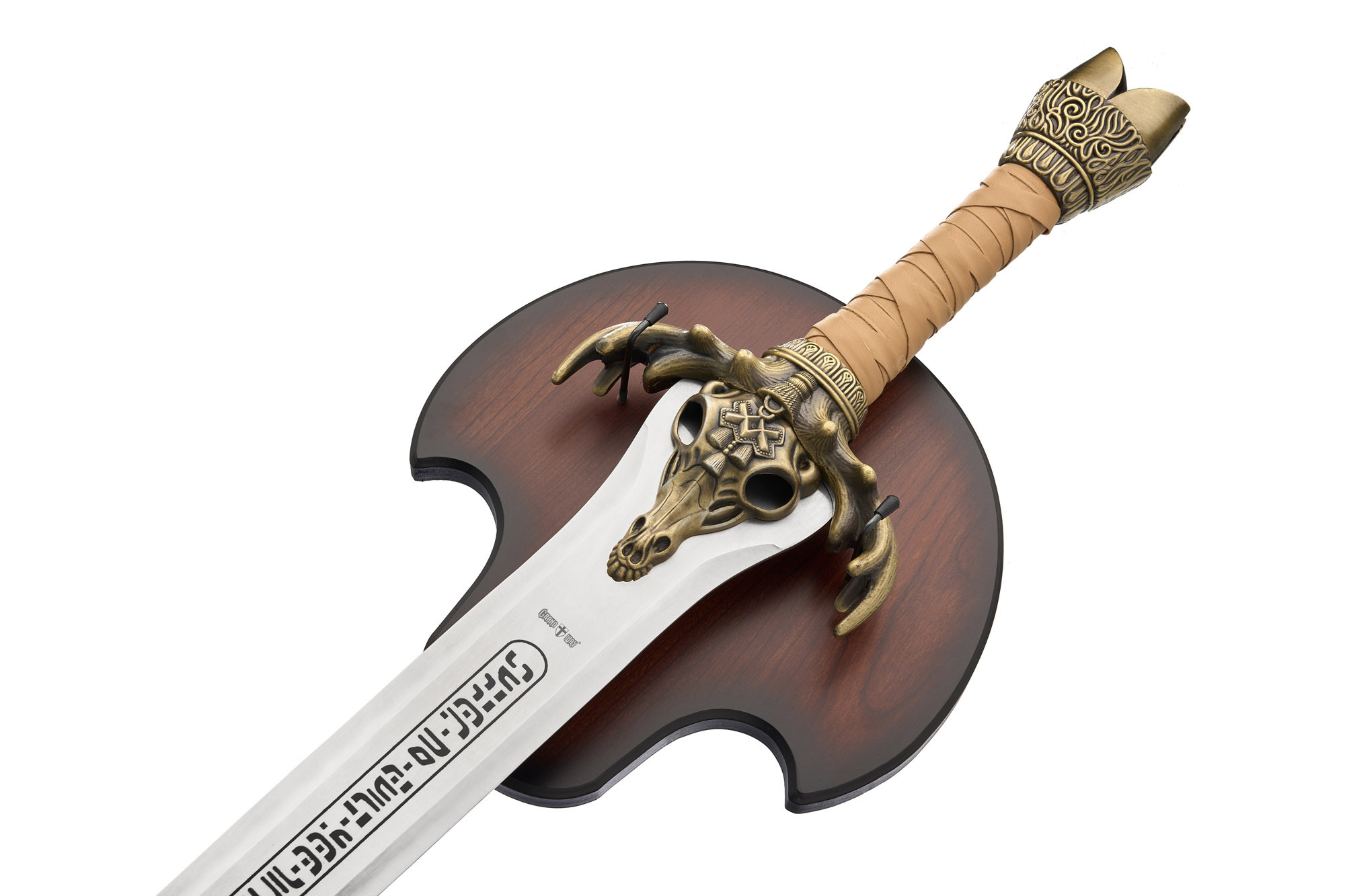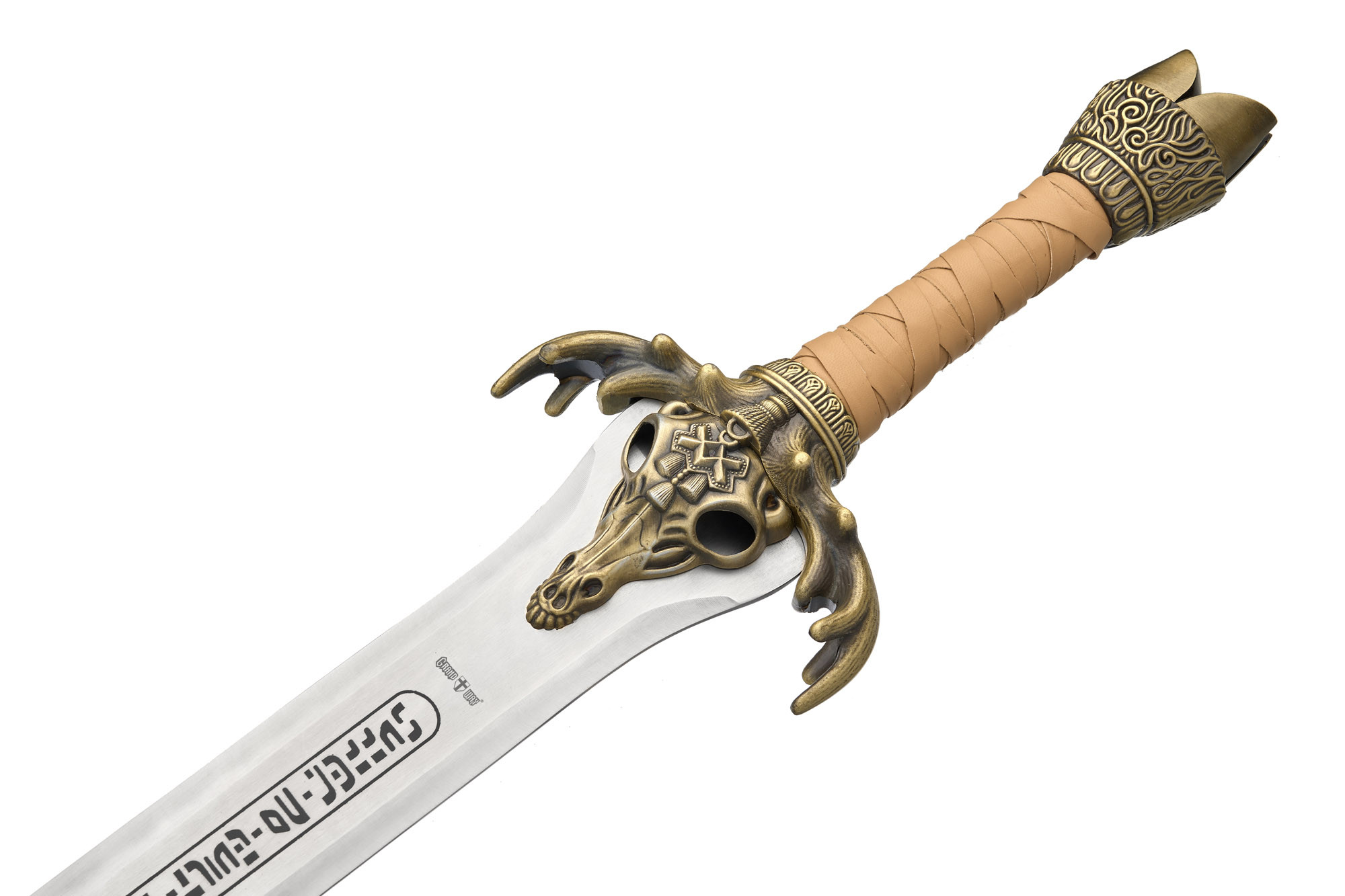 Руків’я обтягнуте шкірою, оздоблене металевою гардою у формі черепа з рогами. Похмурий і впізнаваний дизайн миттєво переносить у світ варварських племен і темних богів, а важке навершя додає відчуття брутальної сили в руці.