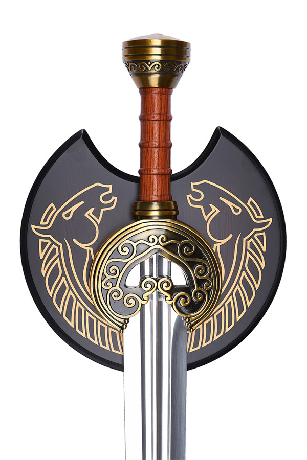 У комплекті з мечем йде панно-підставка, що має добре відому форму стародавнього легкого щита – пельти, прикрашеної «кінським» орнаментом у роханському стилі. Дизайн оформлення панно також відомо заснований на стилі прикрас та орнаментів вихідного фільму. Така оригінальна підставка зі смаком доповнює загальний вигляд сувеніру та дозволяє надійно закріпити його на стіні будь-якого стандартного приміщення.