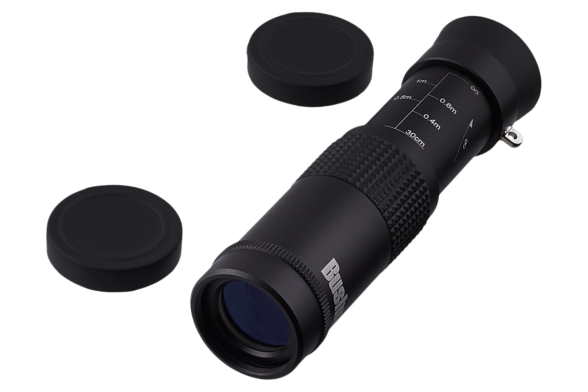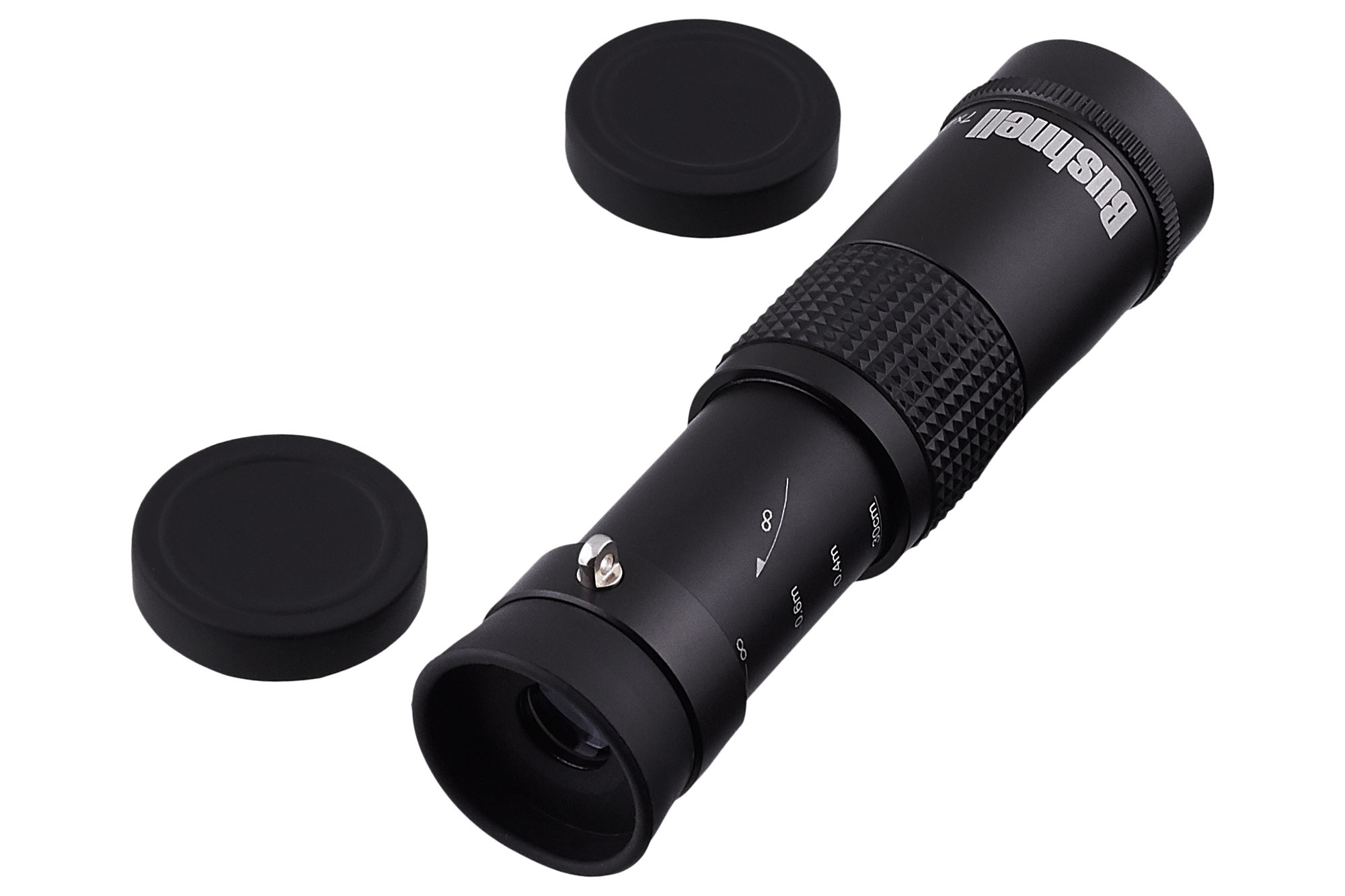 Прибор сконструирован с использованием компактных руф призм из стекла ВК-7 и линз с многослойным просветляющим покрытием. Оптическая начинка прибора помещена в прочный корпус из анодированного алюминия. Оригинально решена система фокусировки монокуляра – вместо привычного для нас вращающегося кольца, расположенного на окуляре, здесь необходимо вращать объектив. Для того, чтобы рука не скользила при настройке фокусного расстояния, производитель предусмотрел широкое рифленое резиновое кольцо. Минимальное фокусное расстояние монокуляра составляет всего 30 см! Наглазник окуляра изготовлен из мягкой гигиеничной резины.