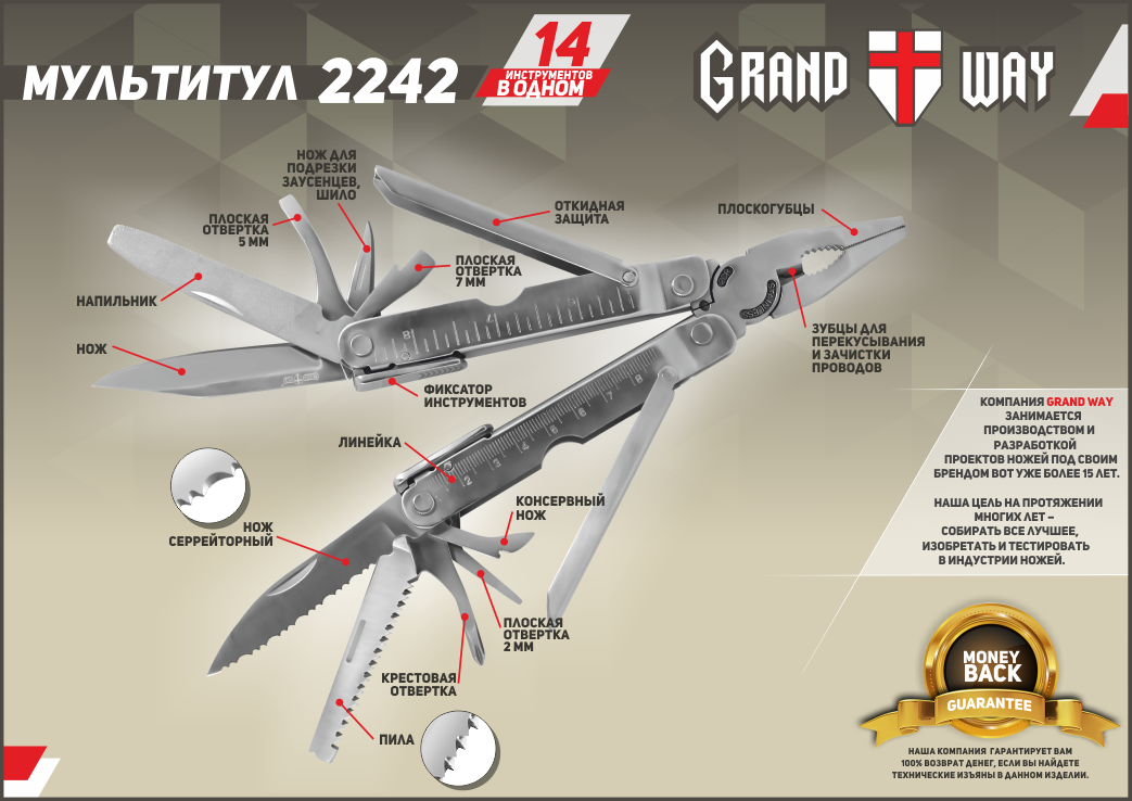 | Дополнительная информация: | Инструменты: пассатижи, кусачки, большой клинок, крестобразная отверка, откуп. бутылок, напильник, консервный нож, плоская ответка, пила |