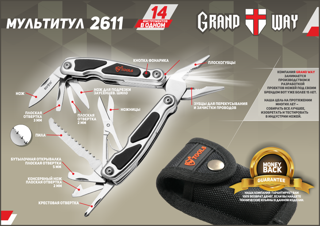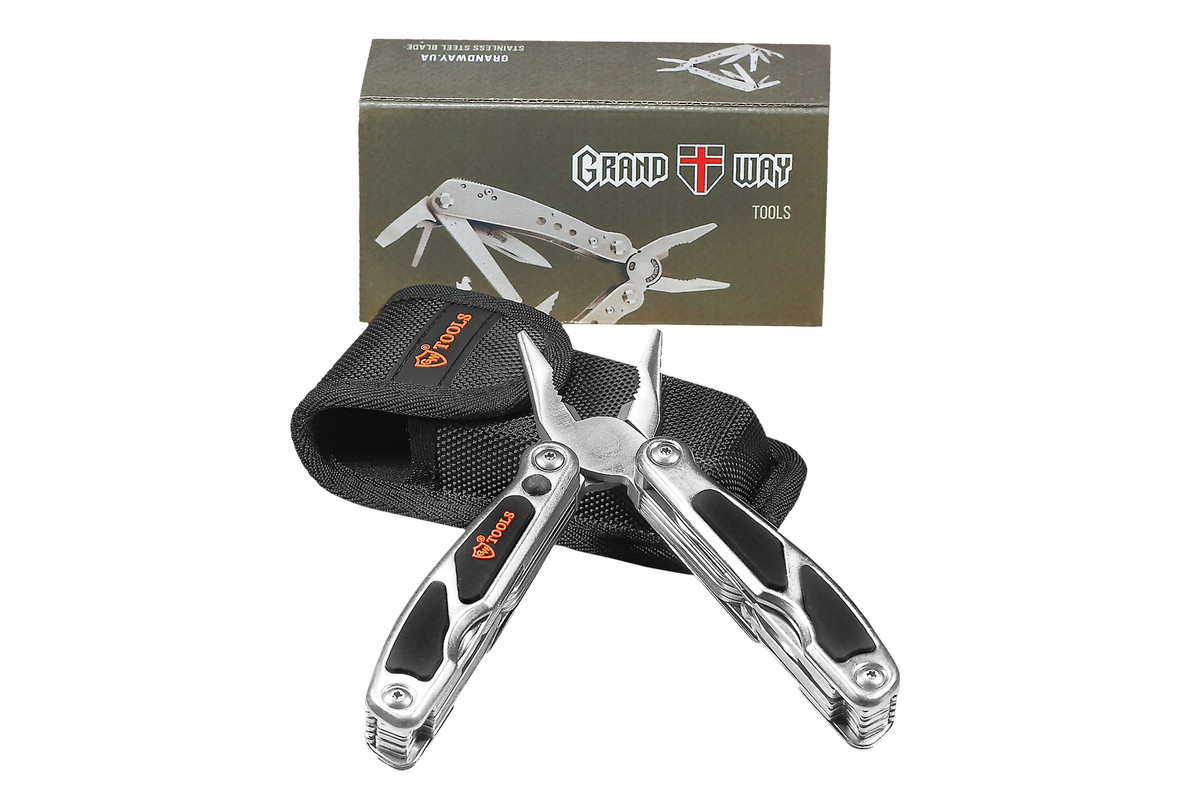 Мультитул Grand Way 2611 - это настоящее сочетание традиции и современных тенденций. Классический мультитул из полированной стали дополнен резиновыми накладками, которые добавляют большей хваткости и не холодят руку. Мультитул укомплектован качественным чехлом из кордуры, сзади на него пришита шлевка, с помощью которой он вешается на ремень и всегда находится под рукой.