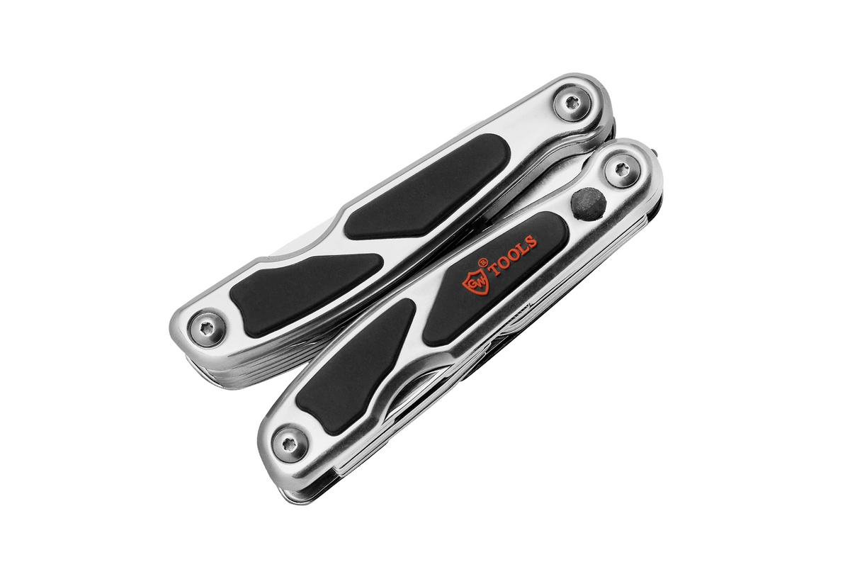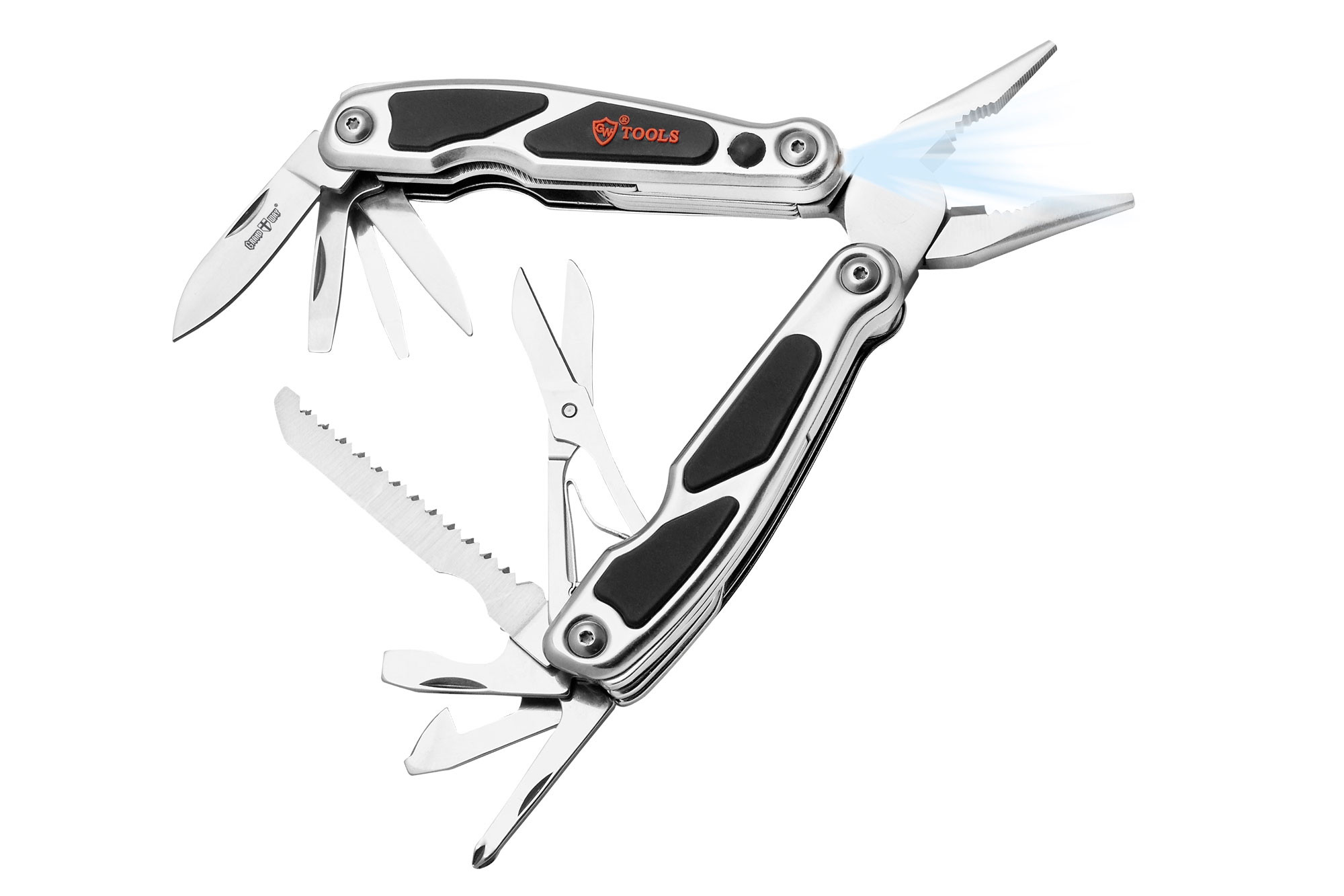 | Дополнительная информация: | Инструменты в комплекте: плоскогубцы, кусачки, нож с прямым лезвием, маленькая плоская отвертка, маленькая крестовая отвертка, открывалка для бутылок, фонарик, ножницы, шило, напильник |