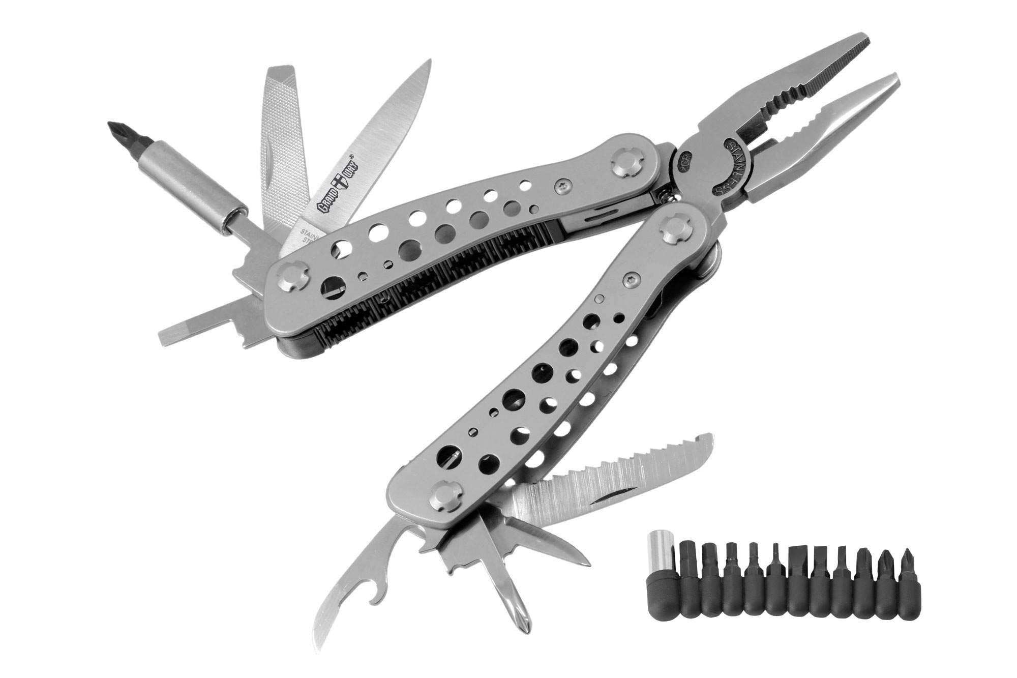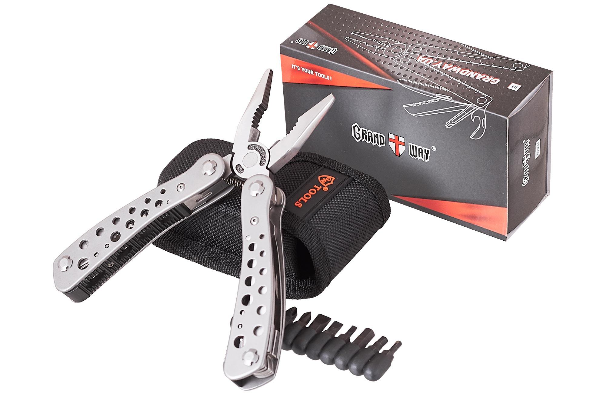 | Дополнительная информация: | Фукционал: плоскогубцы, кусачки, нож, битодержатель, набор бит, напильник, бутылочная открывалка, консервный нож, зачистка изоляции, прямая отвертка, шило, крестовая отвертка, пила |