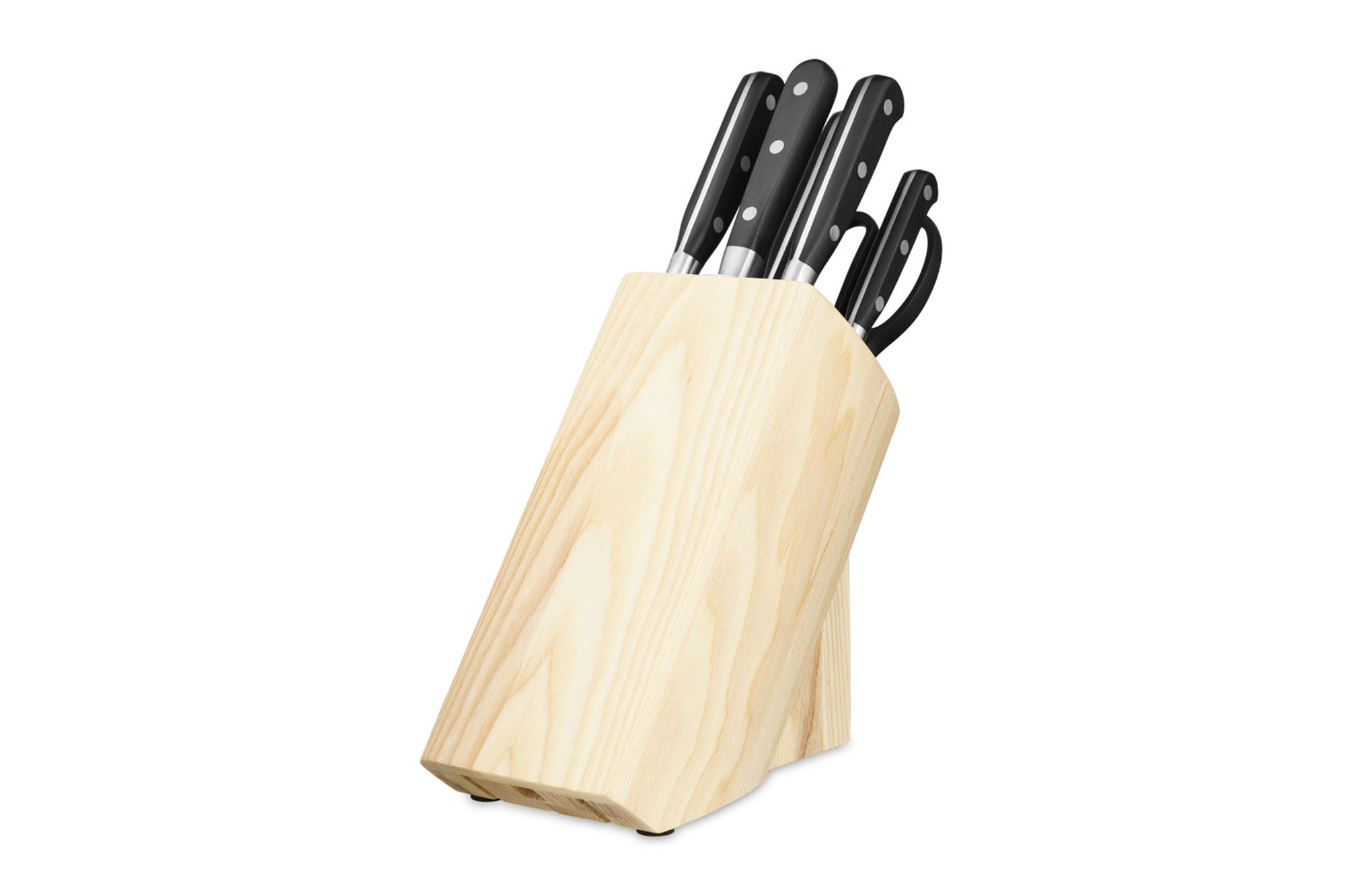 - Набір виглядає дуже презентабельно, підставка-блок з натурального дерева стане окрасою будь-якої кухні.