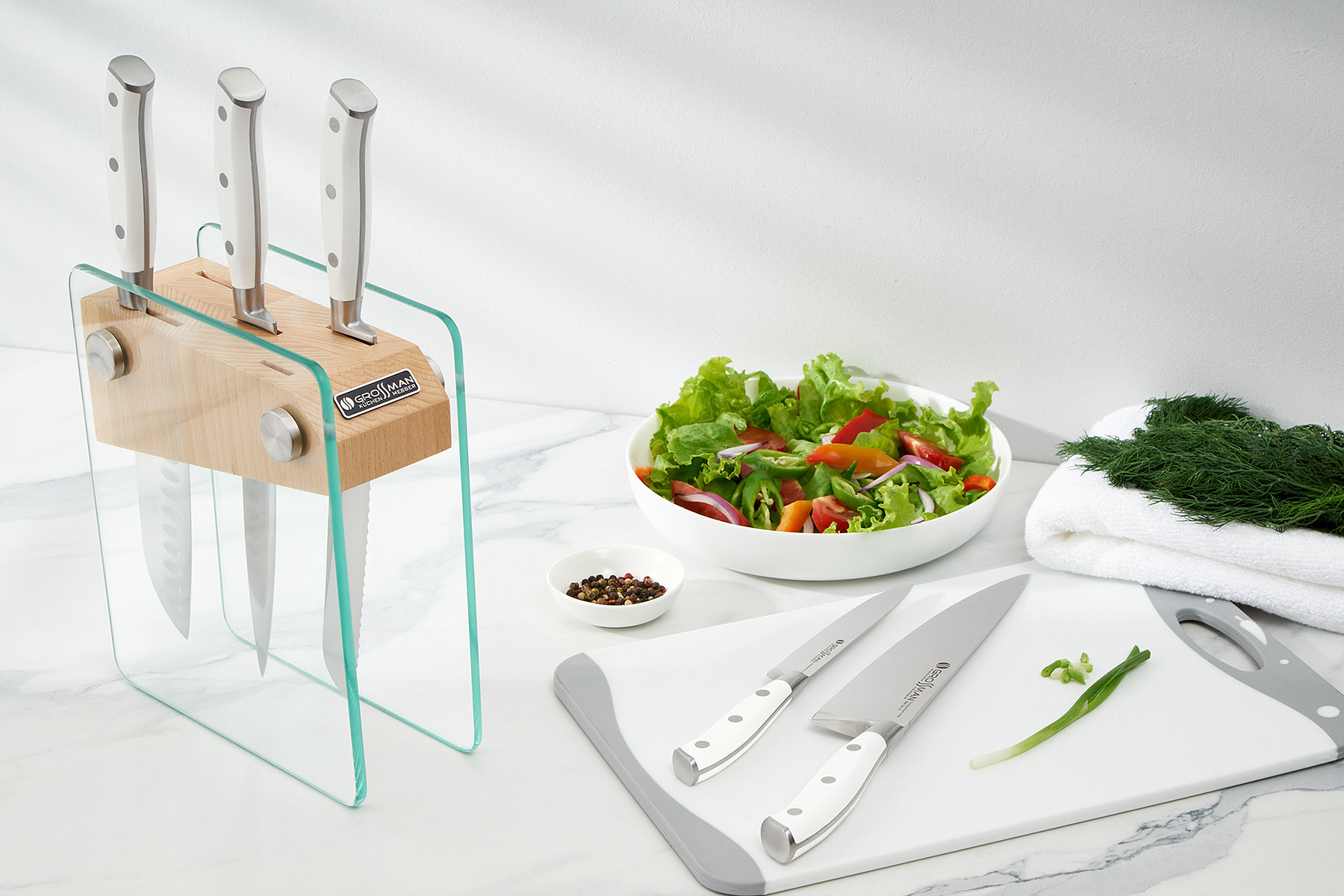 - Підставка для ножів 200*81*230 (1900г.) з ножами (2730г.) колір блоку: RAL1001 (Beige), колір руків’я: RAL9003 (Signal white), матеріал: Скло-дерево