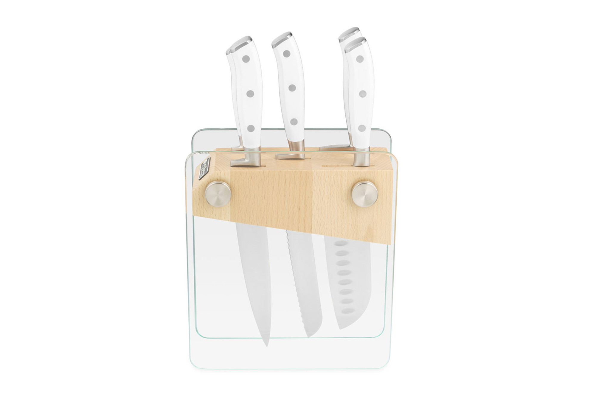 - Підставка для ножів 200*81*230 (1900г.) з ножами (2730г.) колір блоку: RAL1001 (Beige), колір руків’я: RAL9003 (Signal white), матеріал: Скло-дерево