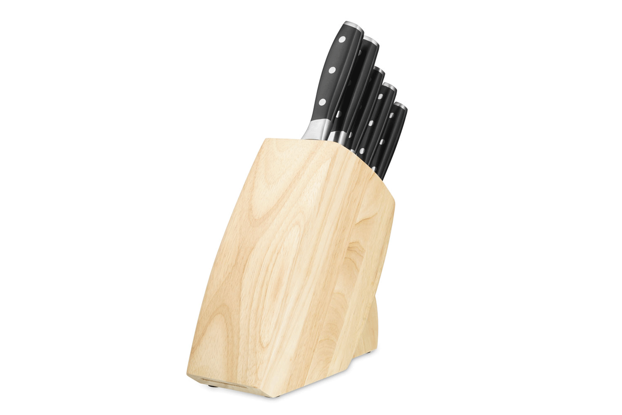 - Підставка із якісного натурального дерева. Всі ножі надійно зберігатимуться у спеціально відведеному для них місці. Дренажні отвори в дні підставки забезпечують захист сталевих лез від впливу вологи.