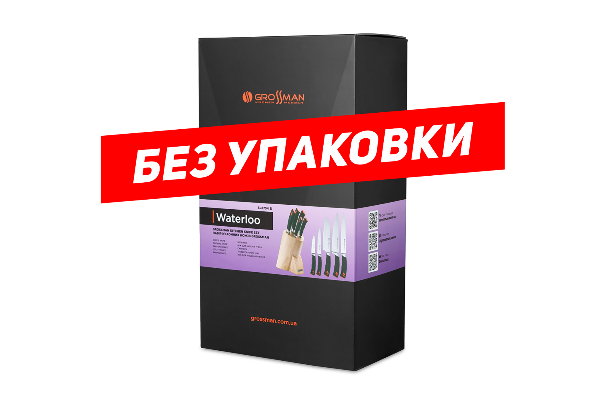 - Висока якість німецької нержавіючої сталі марки 1.4116 добре відома по всій Європі. Сталь виробляє німецька компанія TussenKrupp AG. І саме з 1.4116 виготовлені усі кухонні ножі у наборі GROSSMAN Waterloo.