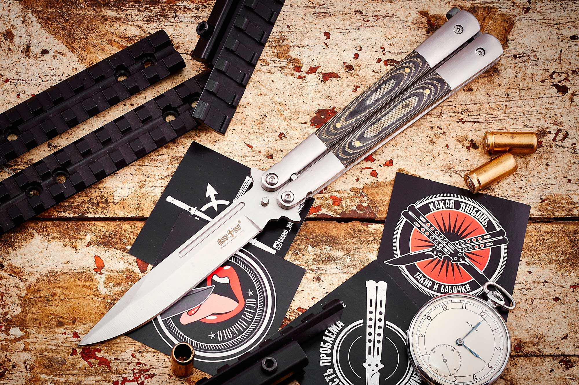 Клинок ножа – сатинированный клип пойнт (clip point) с небольшими долами и традиционными для балисонгов гардообразными упорами под пальцы у пяты клинка. Несмотря на умеренные размеры (длина лезвия 105 мм), такой балисонг выглядит серьёзно и по-боевому.