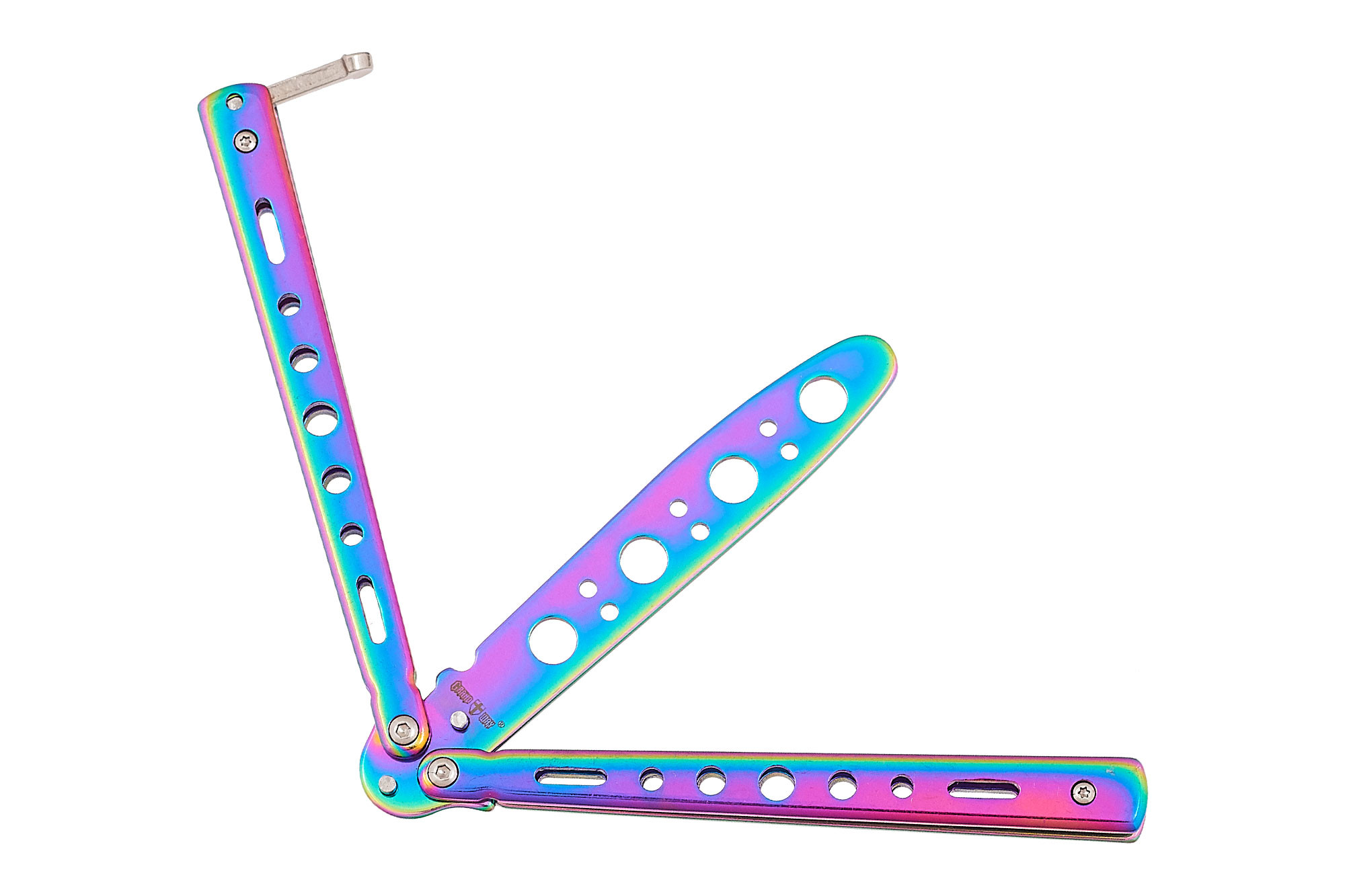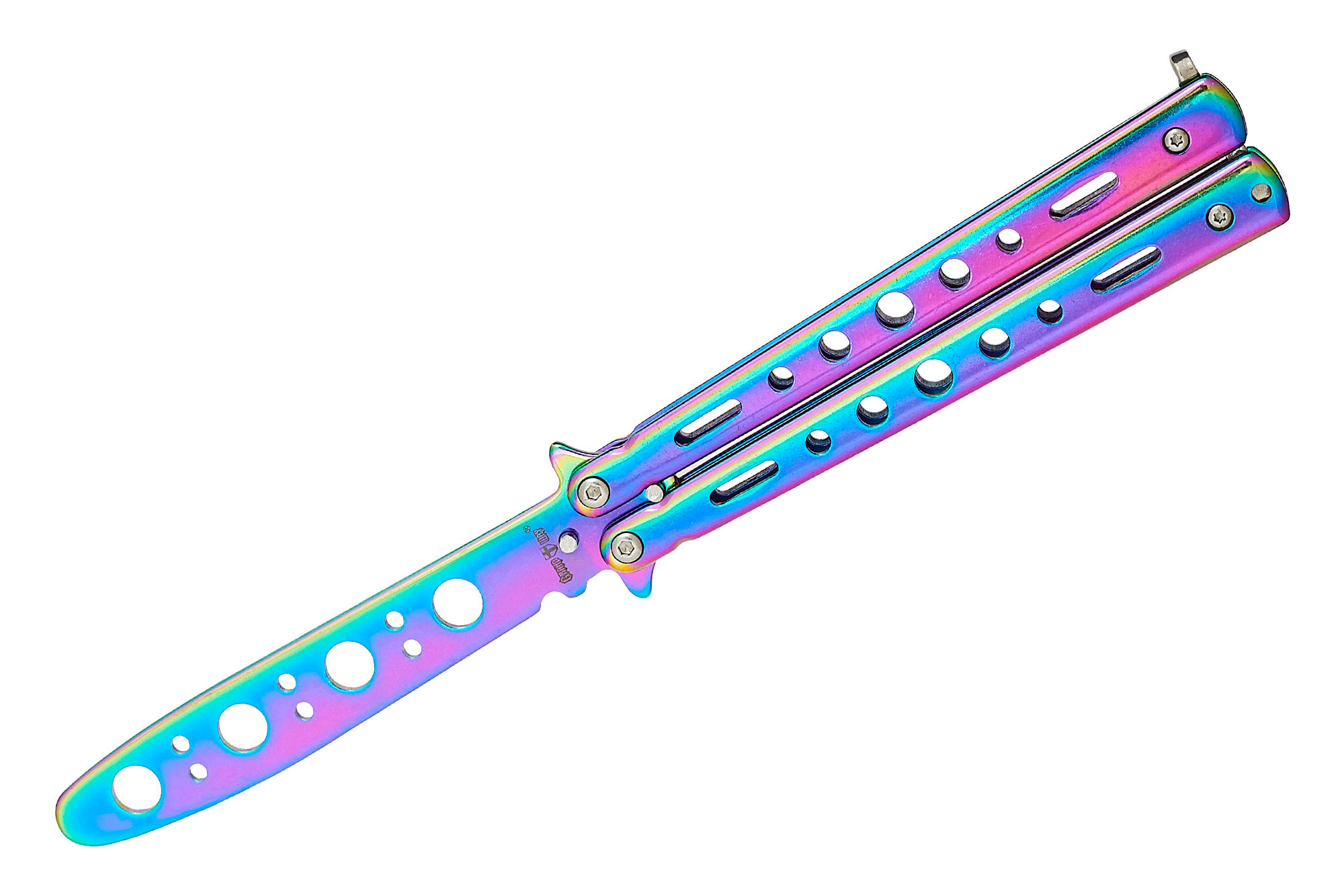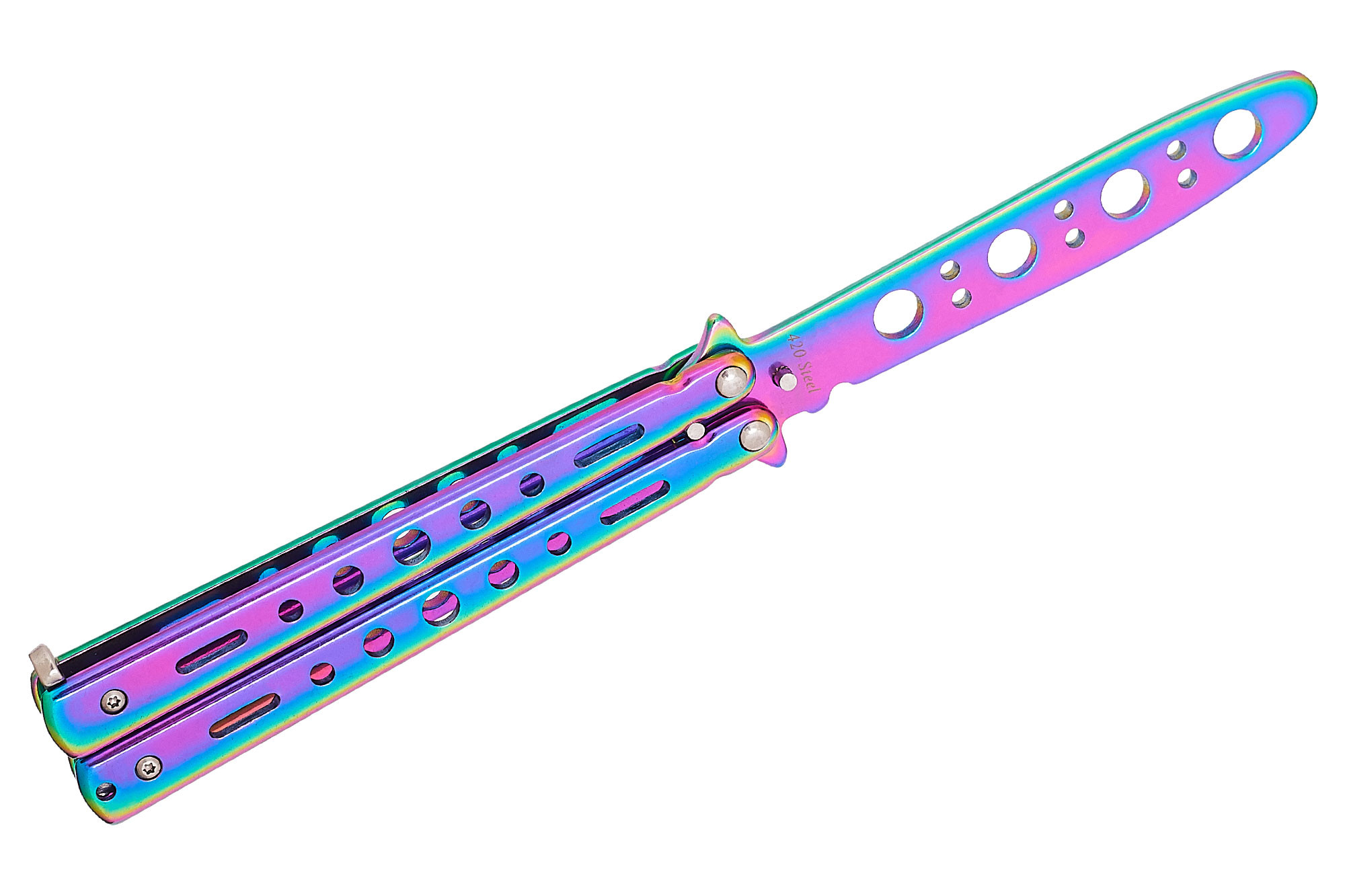 Как такового клинка у этого балисонга нет – вместо него имеется специальная, не заточенная пластина с отверстиями, функция которых не исключительно декоративная, но и практическая: облегчение веса.