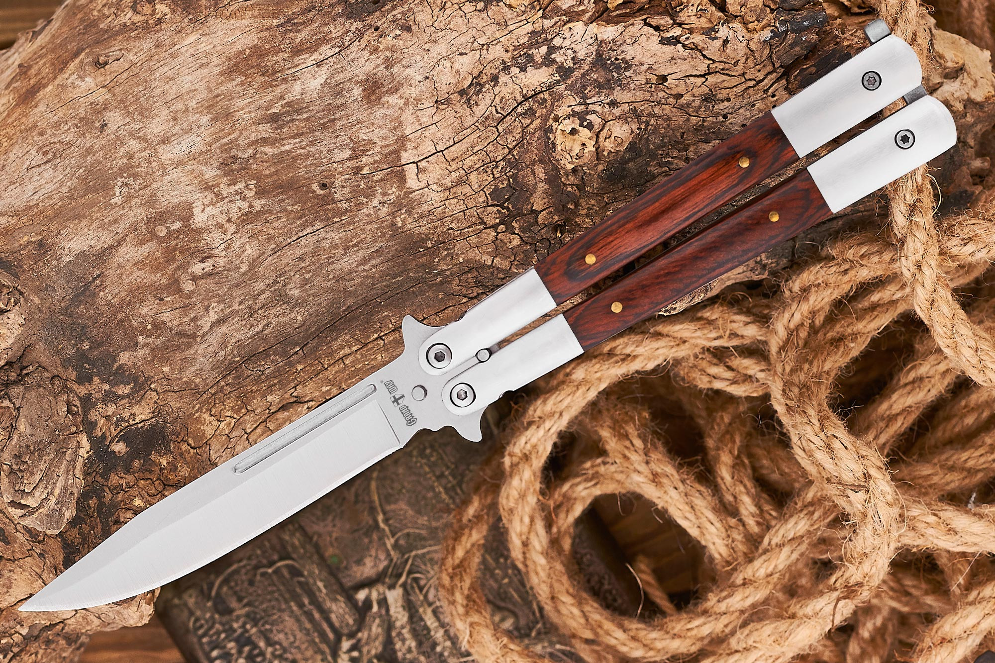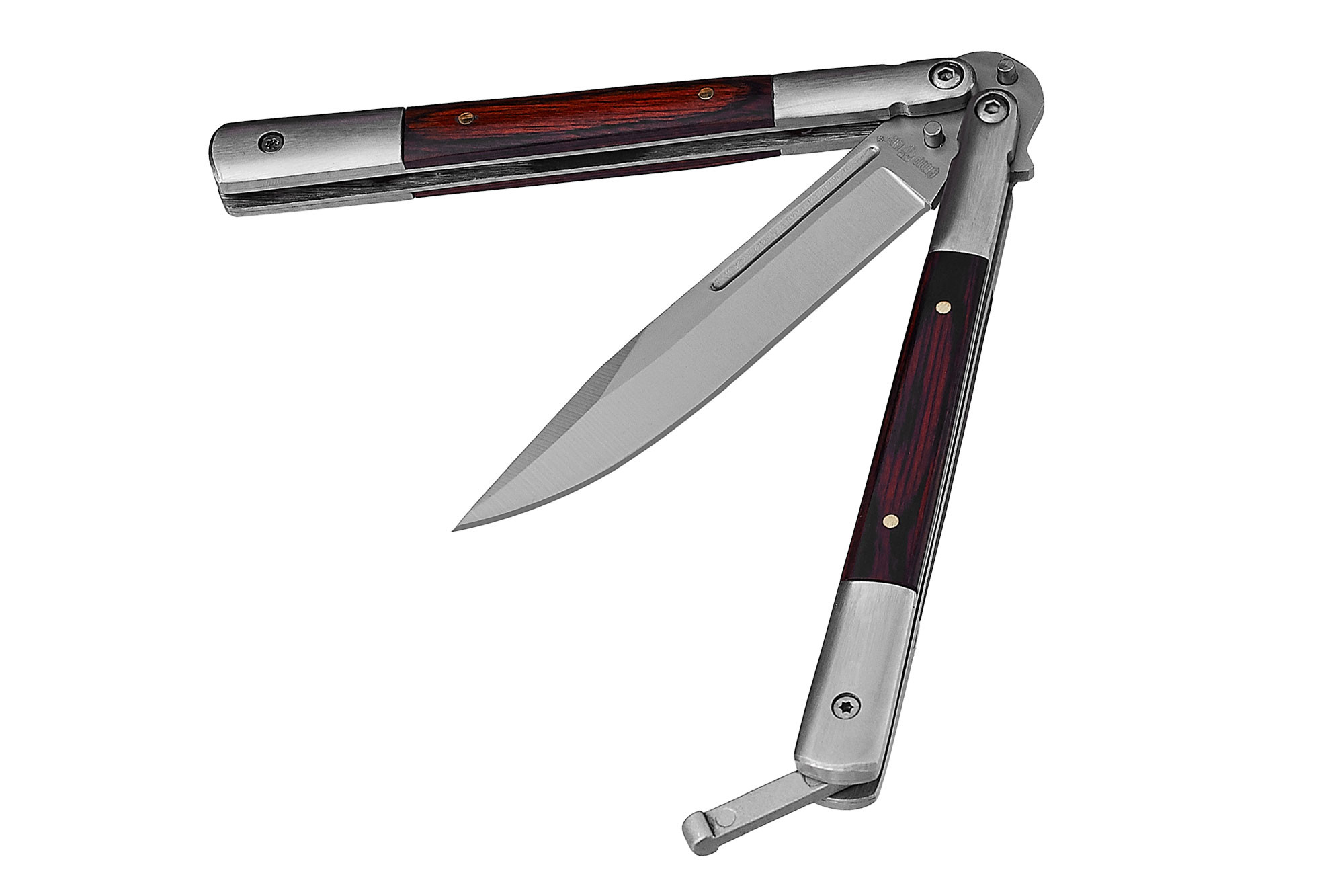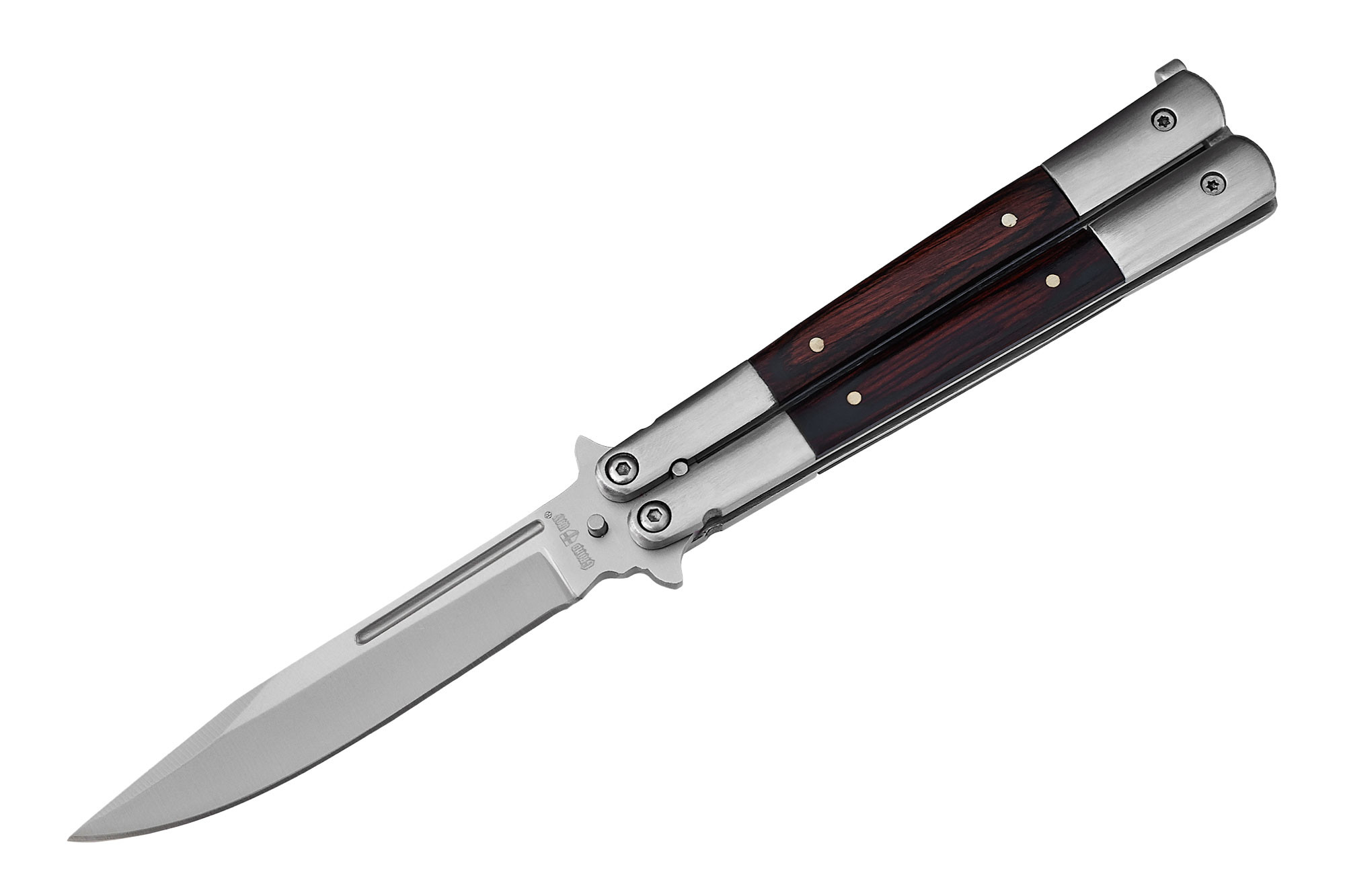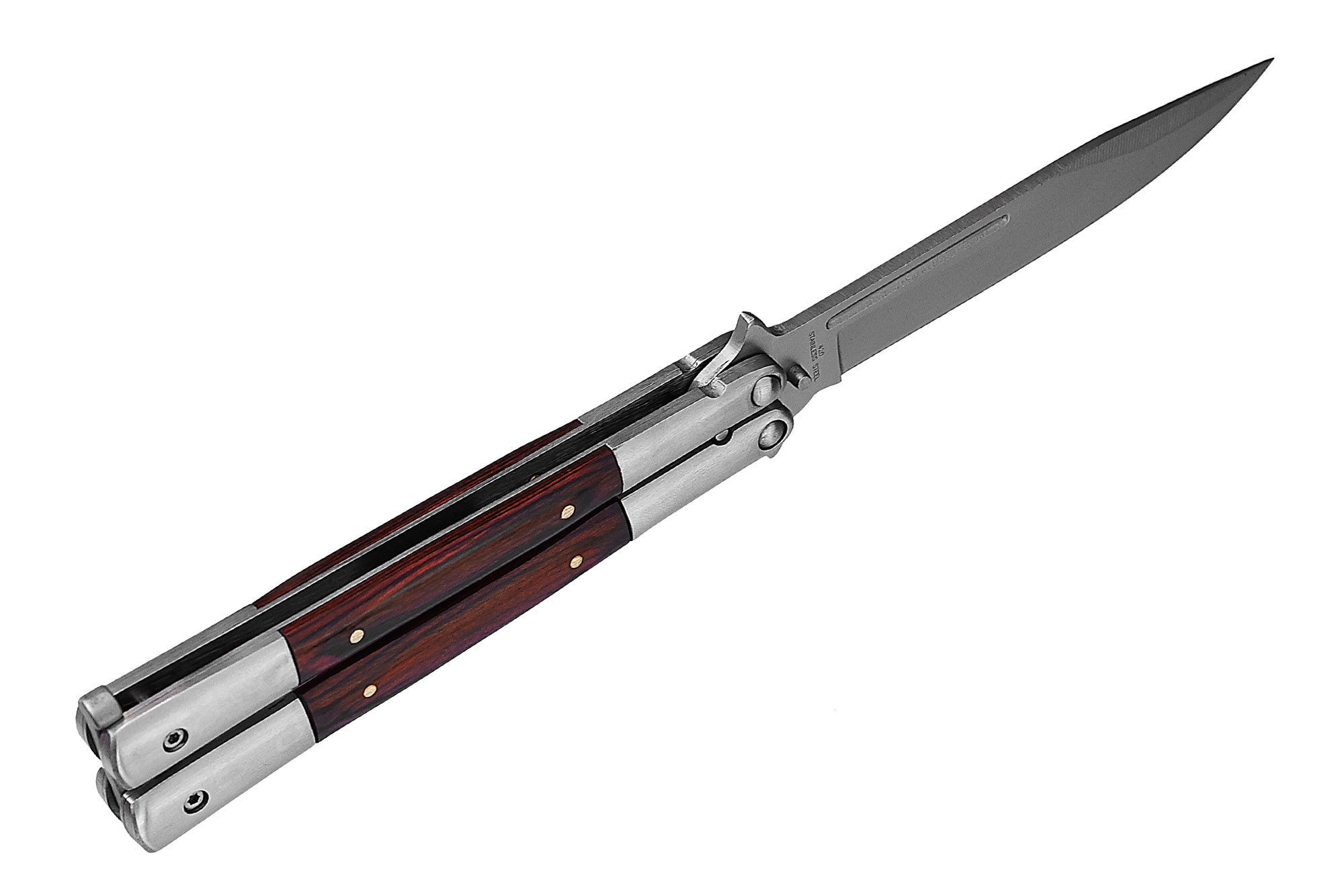 Балисонг 15079 – это сочетание современных технических решений и дани традициям. Формы клинка и общий дизайн тут вполне традиционны, а для накладок рукояти использован натуральный материал – дерево.