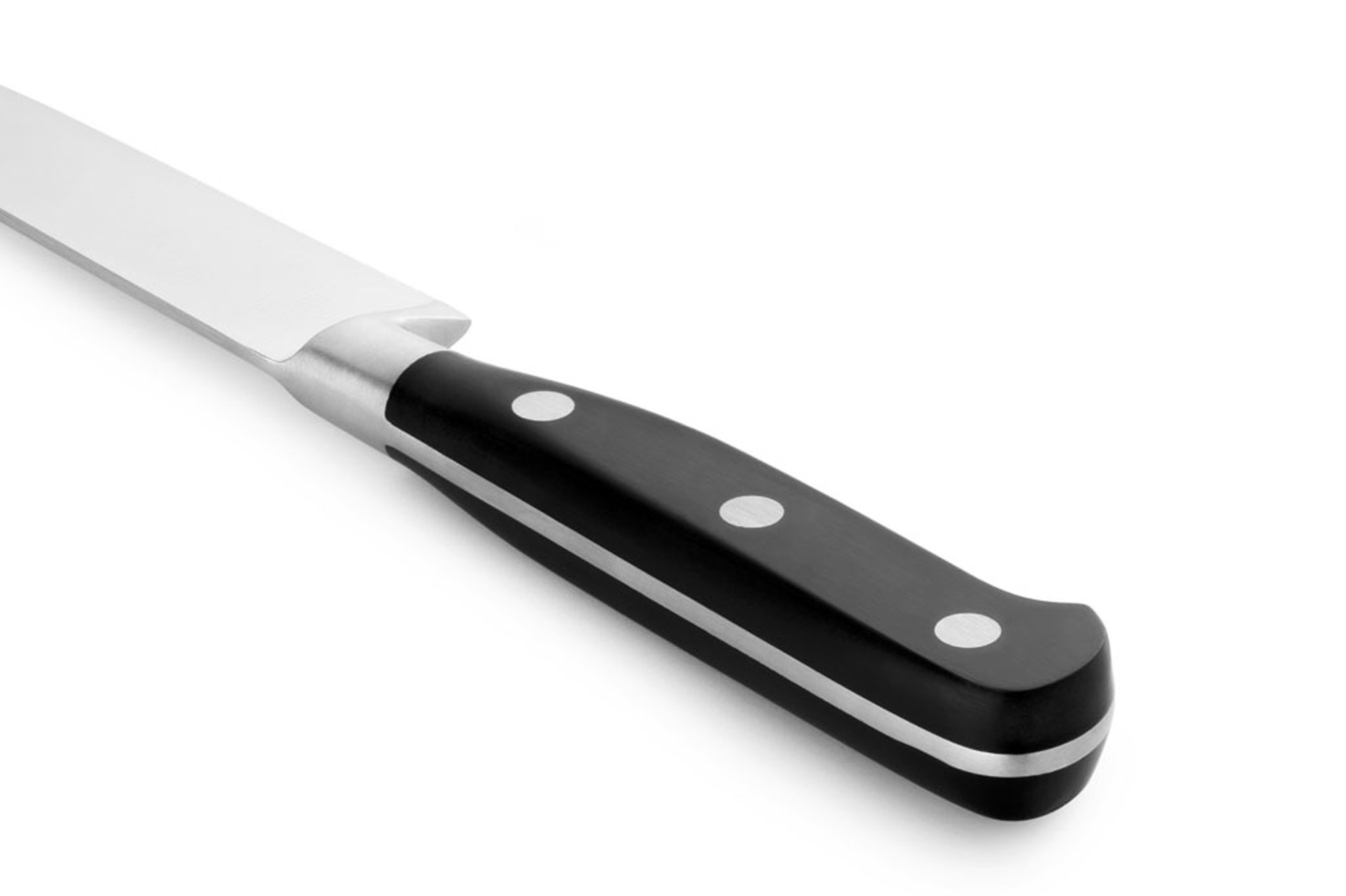 У ножа для нарізки довгий і прямий меч. Він не загрузне в матеріалі, що розрізається. Навпаки, пройде крізь нього легко, одним рухом. Зріз вийде рівним та акуратним. А порції, що нарізаються, – однаковими.