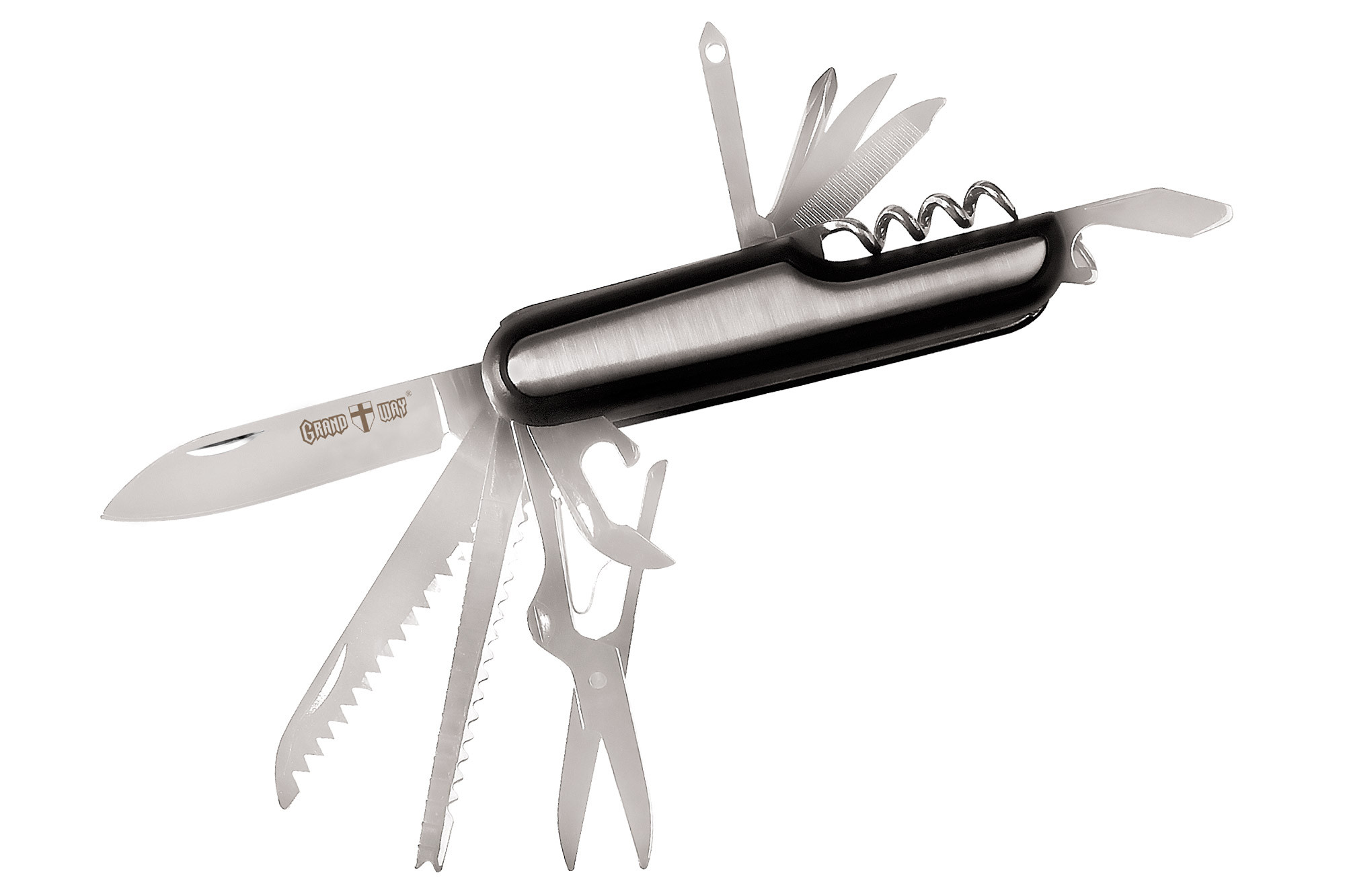 Удобный и лёгкий многофункциональный нож Grand Way 100097 (10 в 1) отличается компактными размерами и корозионно устойчивым корпусом из алюминия и пластика.