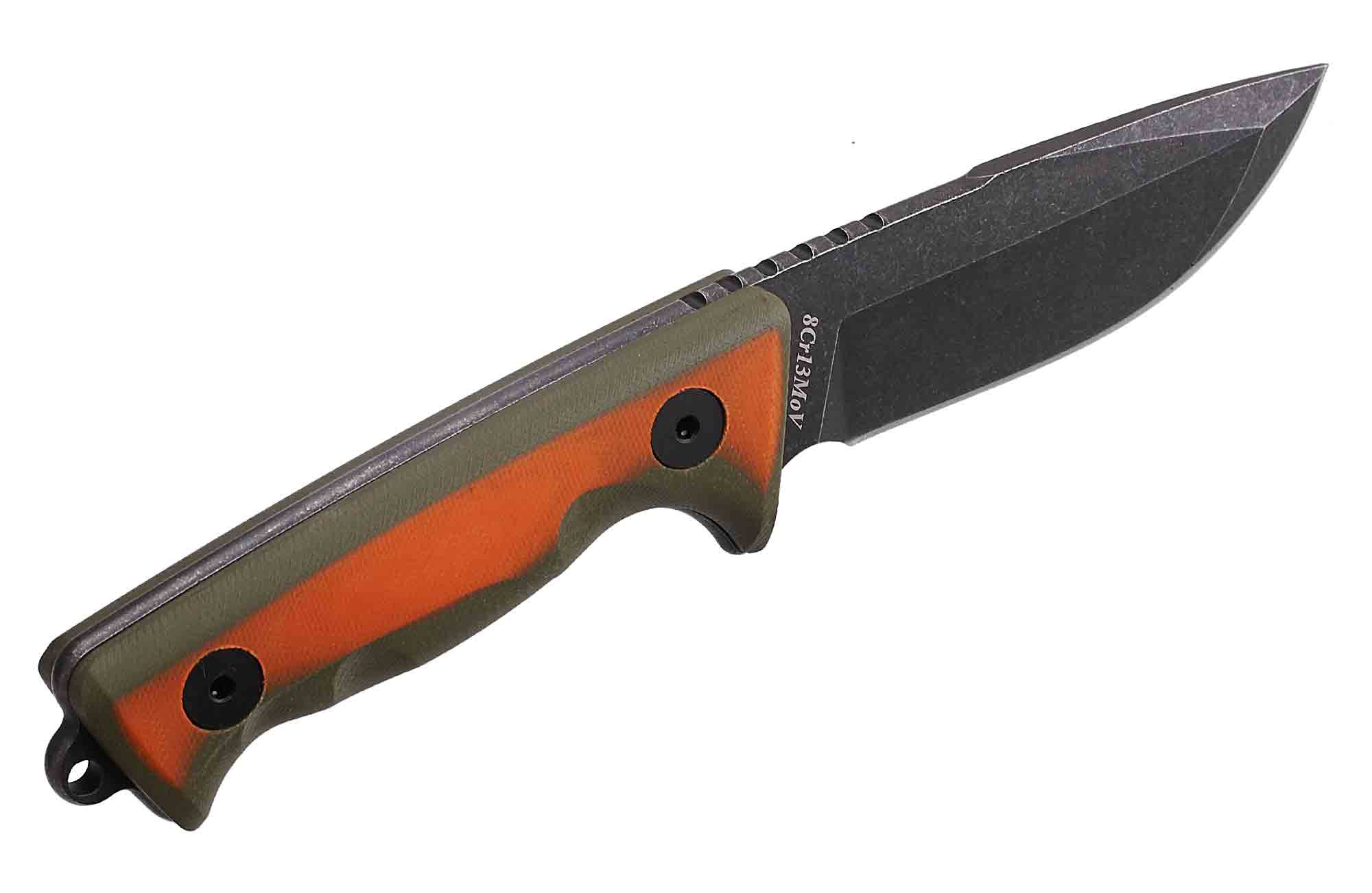 Виготовлений клинок із 8Cr13MoV – однієї з найпопулярніших нержавіючих ножових сталей. Ця нержавіюча високовуглецева, середньохромиста сталь вважається приблизним аналогом японської сталі AUS-8. Вона має гарні антикорозійні властивості. Зроблені з неї ножі довго зберігають свою гостроту.
