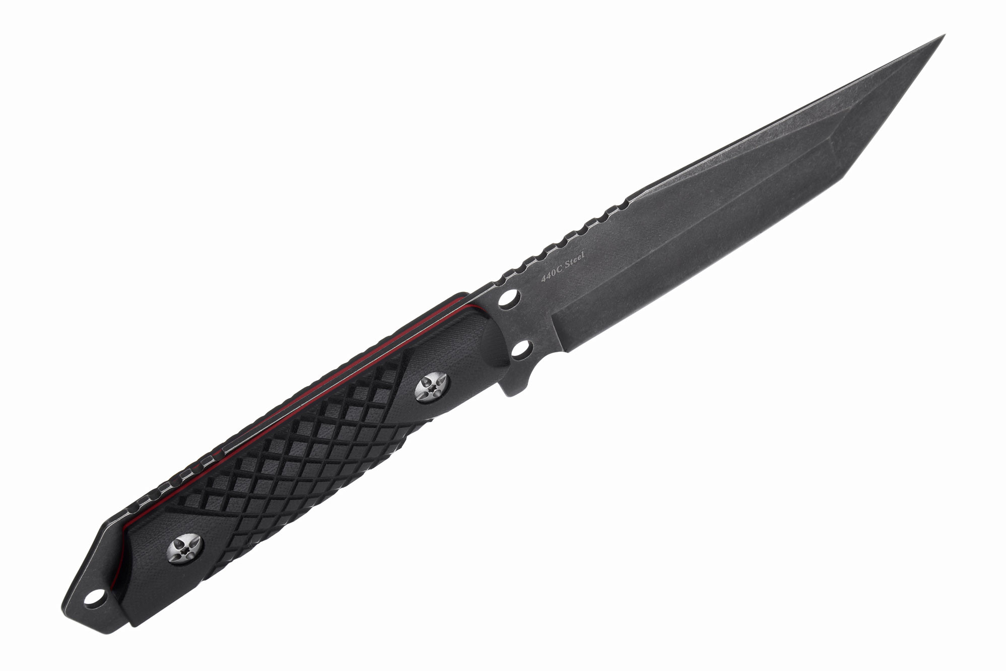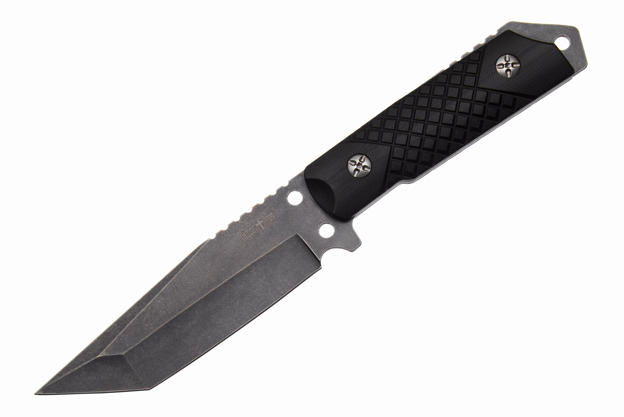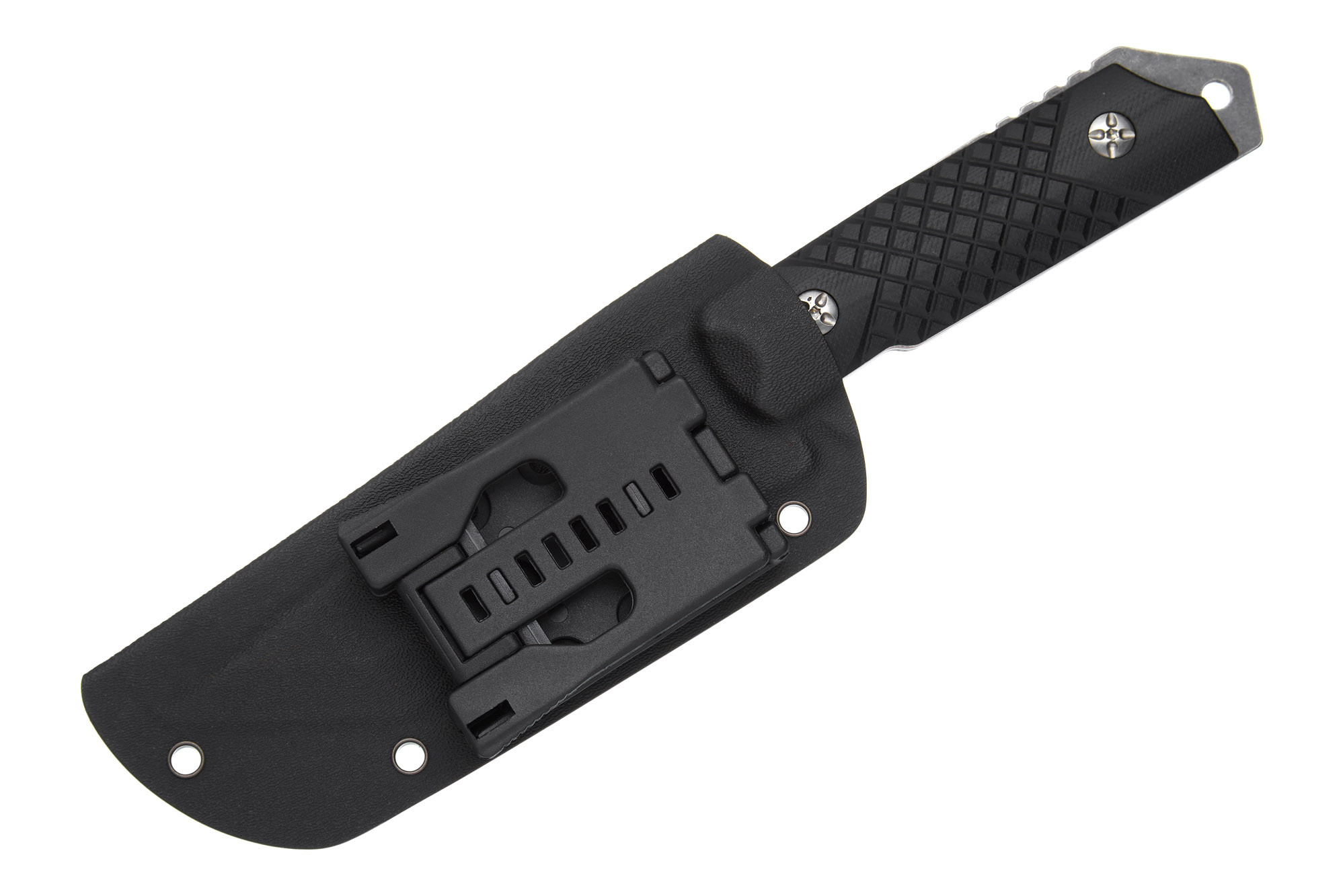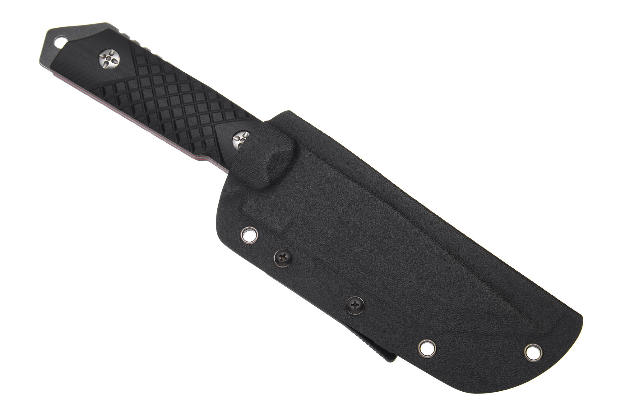 - Руків'я – фултанг з накладками із міцного та стійкого до впливу середовища композиту G10. Сталевий хвостовик, що йде на всю довжину рукояті, гарантує міцність ножа. Виріз та упор під пальці підвищують надійність хвата. Текстурована G10 відома тим, що не ковзає та добре чіпляється за долоню. Руків'я навмисно зроблене не надто товстим, щоб спростити носіння ножа. Як уже було вказано вище, поєднання міцності та компактності – одна з «фішок» цього ножа.