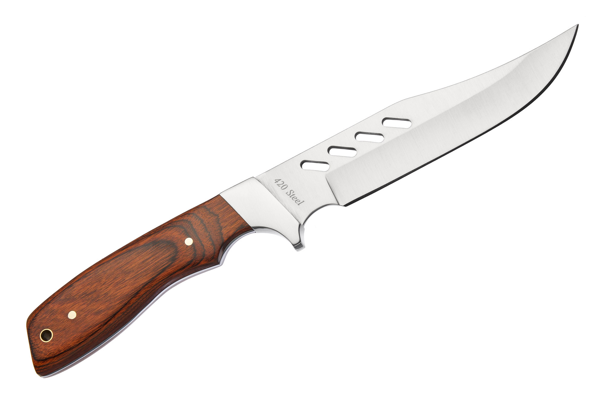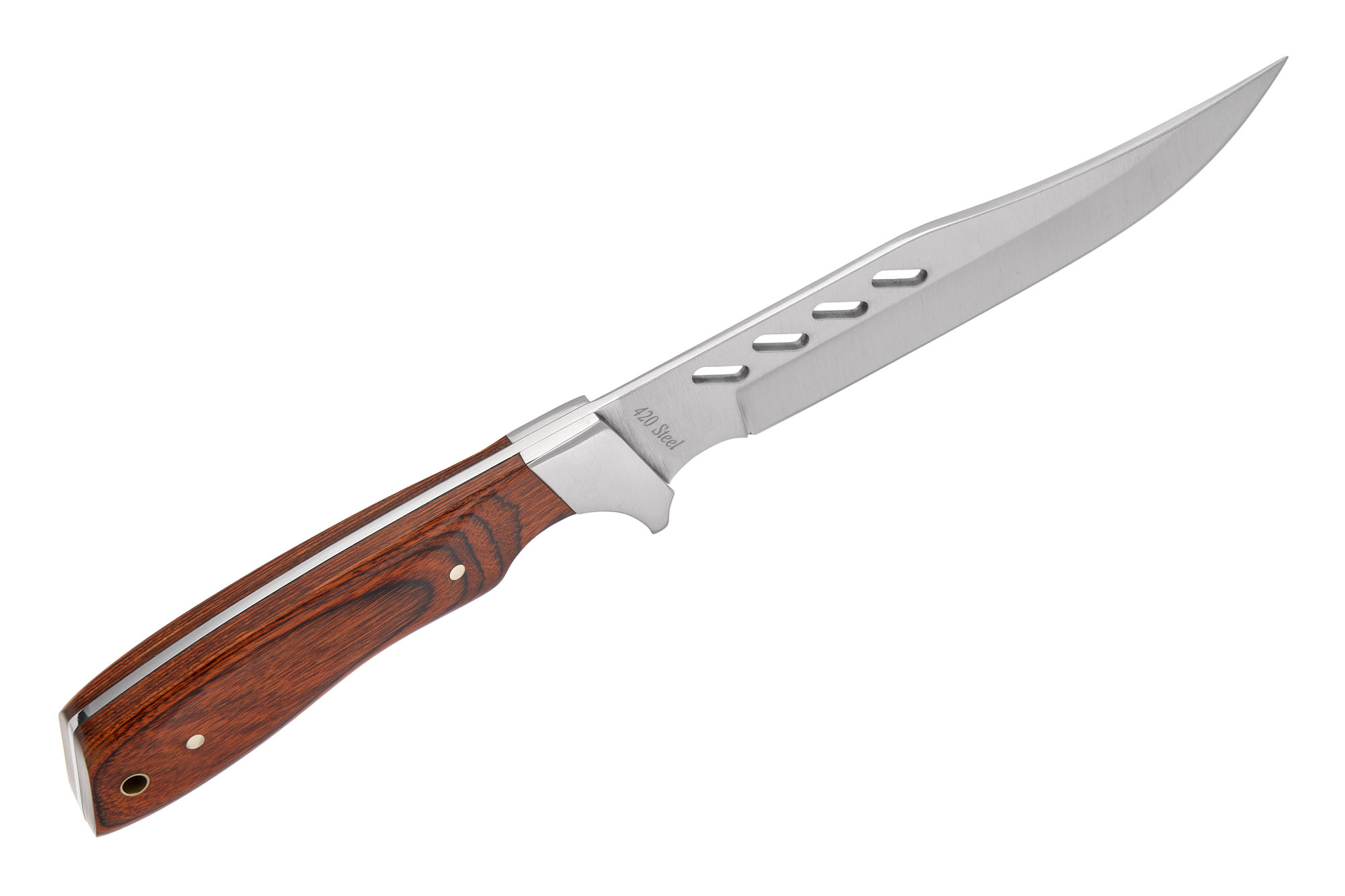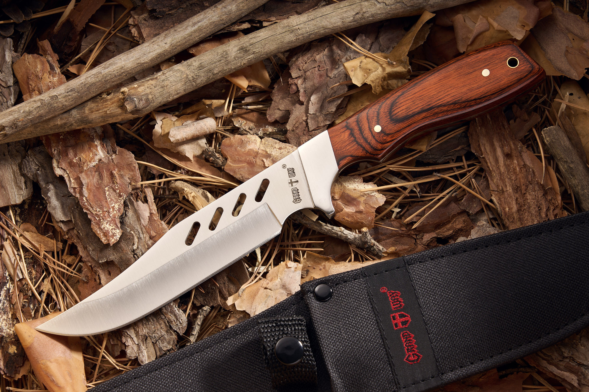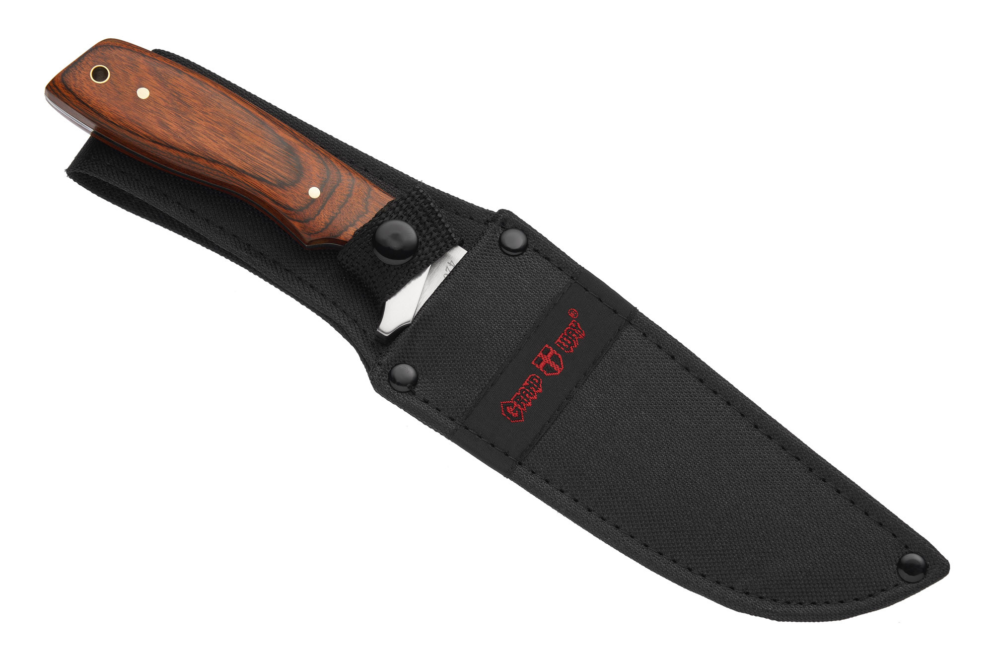 Зручне руків’я ножа виконане за конструкцією фултанг, що означає, що клинок та хвостовик виконані у вигляді суцільної смуги нержавіючої сталі, на яку з боків прикріплені дерев'яні накладки. Такі ножі відомі своєю надзвичайною надійністю та міцністю. Ви можете побачити весь хвостовик ножа, на всю його довжину,та самі переконатись у надійному кріпленні клинка до руків’я.