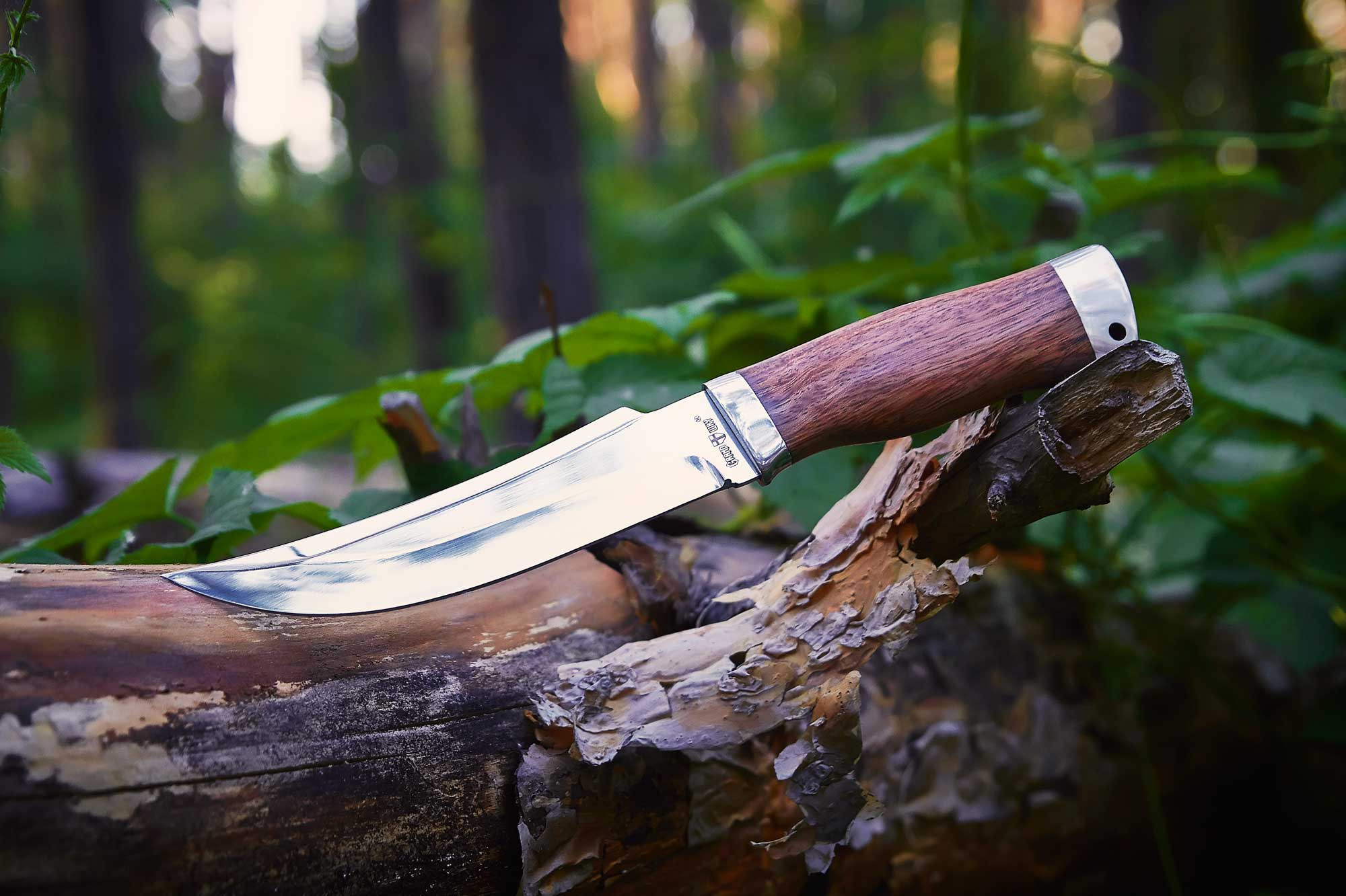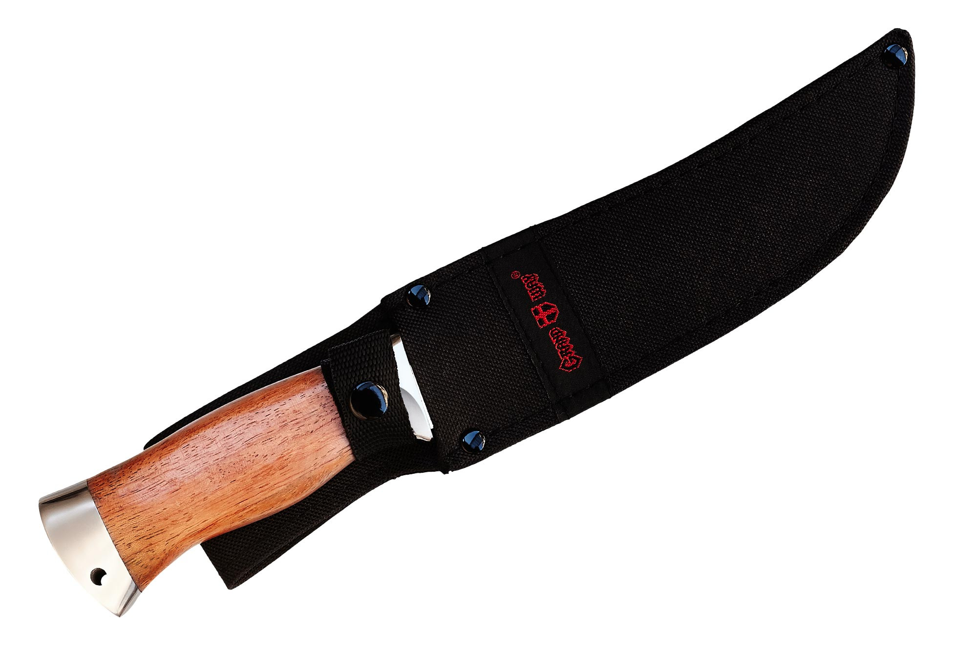 Рукоять ножа имеет эргономичную форму и выполнена из натуральной древесины. Для защиты деревянной рукояти нож оснащен стальным больстером, образующим небольшой, но эффективный упор для кисти, и таким же навершием, с отверстием для темляка. Сечение рукояти – овальное. По достоинству оценить такую рукоять Вы сможете зимой – она не холодит руку, что позволяет достаточно свободно работать ножом. Древесина рукояти пропитана средствами, исключающими пагубное воздействие влаги и вредителей.