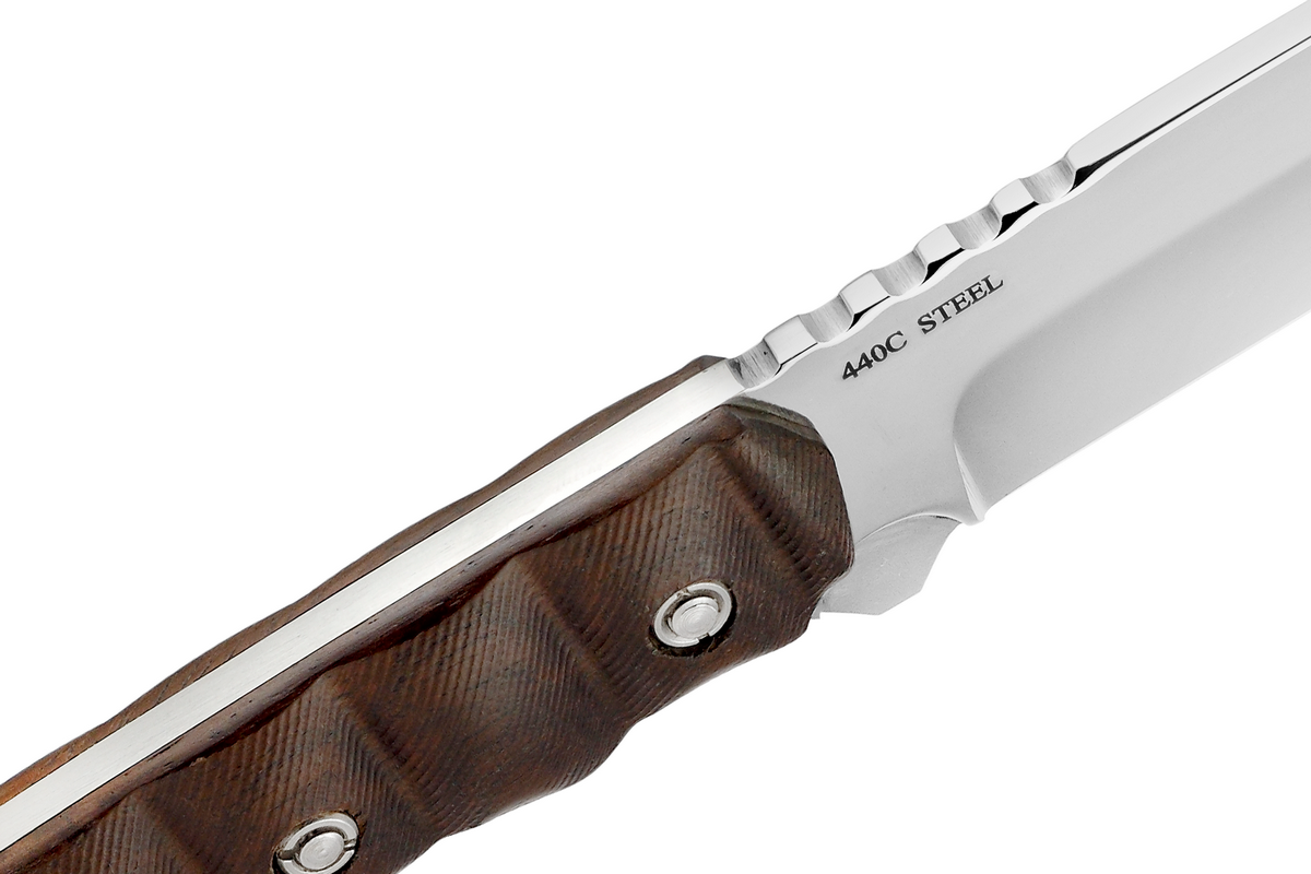 Полированный клинок хищной формы изготовлен из отработанной в производстве высококачественной нержавеющей стали марки 440С. 440С уже давно стала стандартом для изготовления качественных ножей. Высокое содержание углерода в этой стали обеспечивает качественный длительный рез, а дополнительные добавки молибдена и ванадия делают эту сталь износостойкой, прочной и стойкой к ржавчине. Некоторая сложность в заточке компенсируется продолжительной работой лезвия без дополнительной правки.