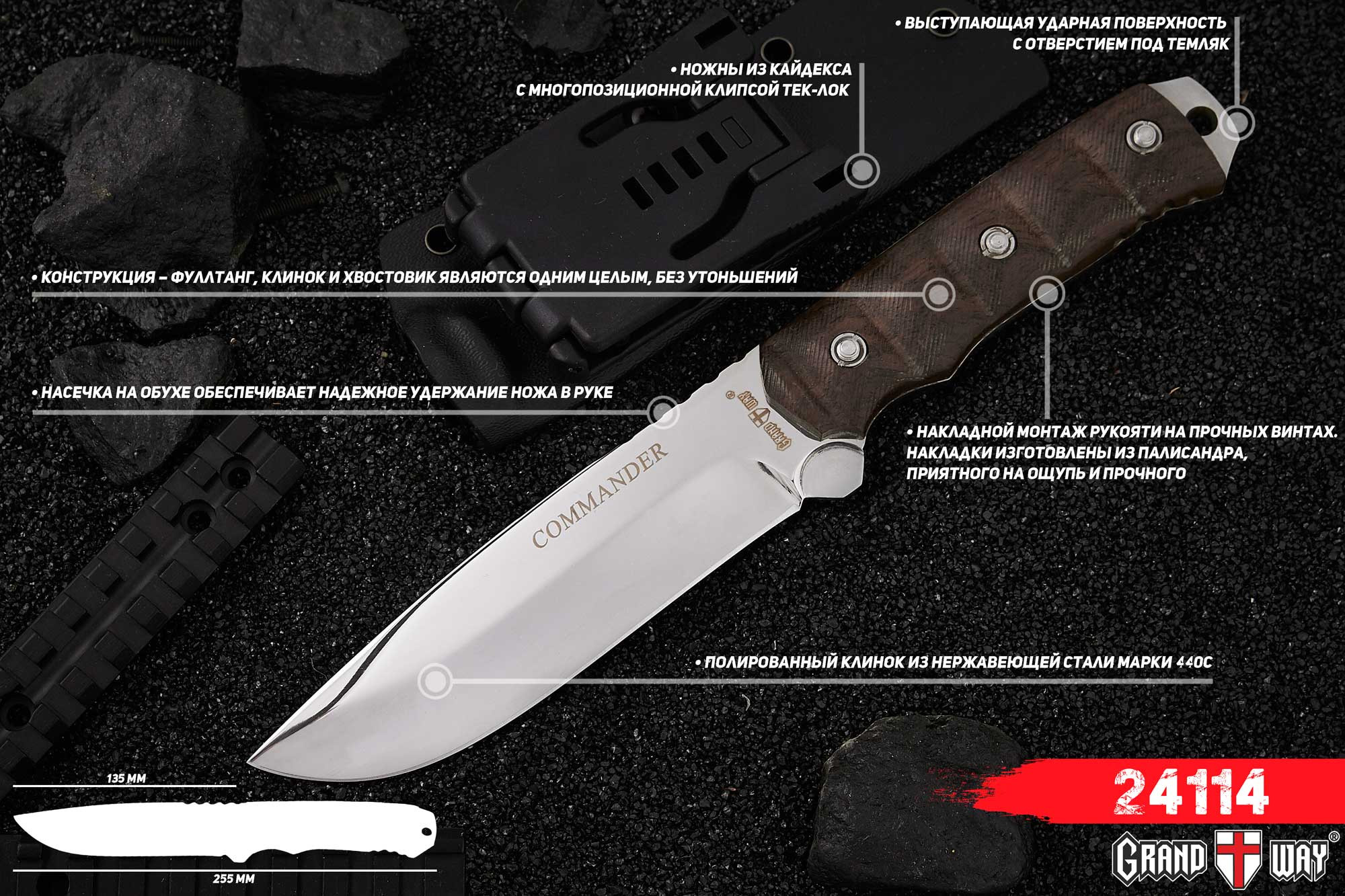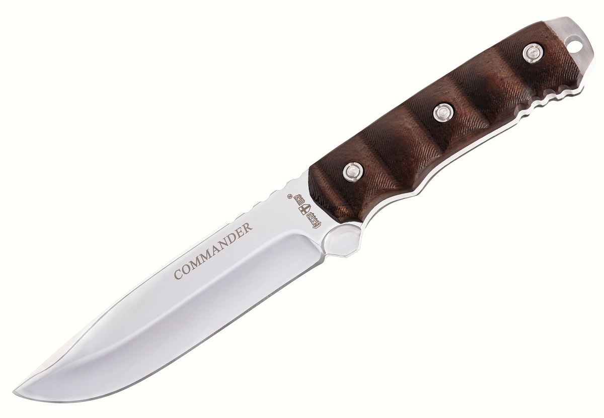 Толстый и мощный клинок продуманной формы справится с любой, даже самой тяжелой работой. Дополнительную прочность ножу придает накладной монтаж рукояти на прочных винтах. Накладки продуманной формы изготовлены из нескользящего армированного полимера, приятного на ощупь и прочного. Благодаря подпальцевым выемкам и насечкам, рукоять прочно и надежно сидит в руке. У ножа есть выступающая ударная поверхность с отверстием под темляк.