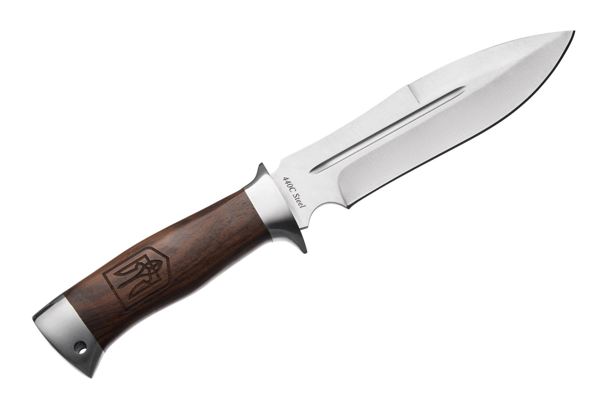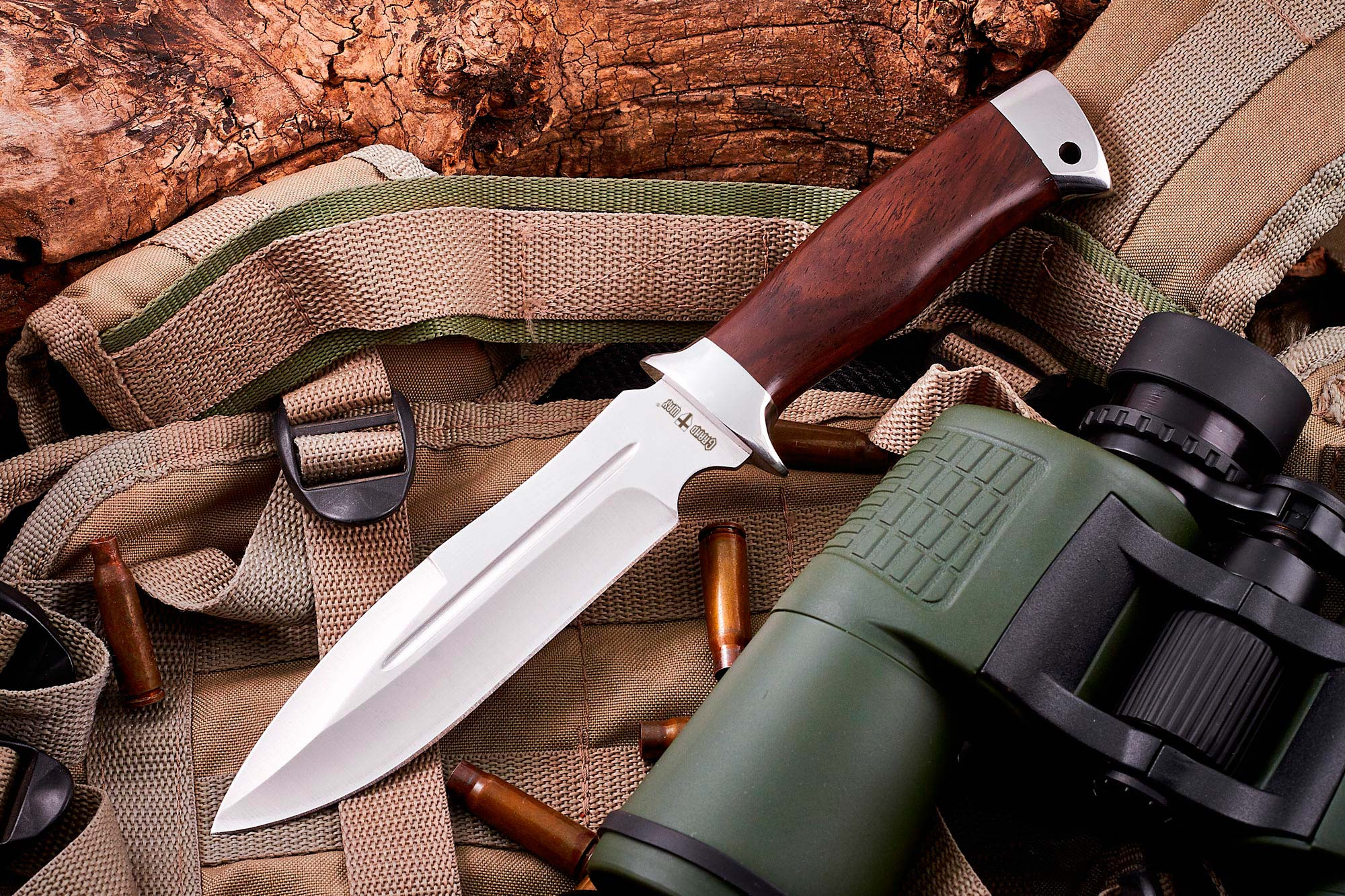 Нож изготовлен с применением схемы сквозного монтажа. Рукоять ножа выполнена из темного палисандра и во избежание разрушения защищена стальным больстером и таким же навершием. Больстер выступает за рукоять образуя очень удобные упоры для руки во время работы ножом. Древесина рукояти пропитана средствами, исключающими пагубное воздействие влаги и вредителей. Все достоинства такой рукояти раскроются зимой - дерево даже на морозе можно комфортно держать в руке. В комплекте с ножом поставляются поясные ножны из кожи высокого качества