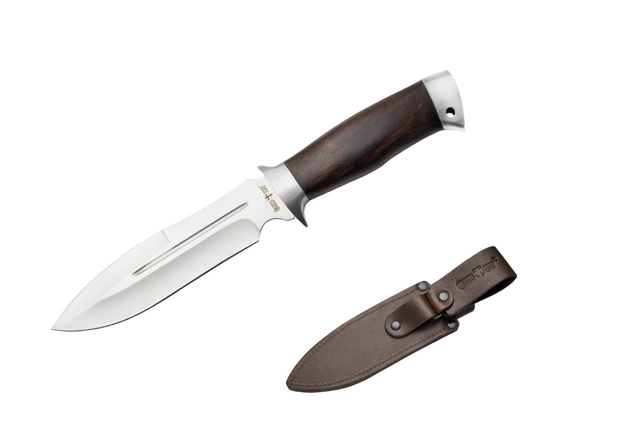 Нож изготовлен с применением схемы сквозного монтажа. Рукоять ножа выполнена из темного палисандра и во избежание разрушения защищена стальным больстером и таким же навершием. Больстер выступает за рукоять образуя очень удобные упоры для руки во время работы ножом. Древесина рукояти пропитана средствами, исключающими пагубное воздействие влаги и вредителей. Все достоинства такой рукояти раскроются зимой - дерево даже на морозе можно комфортно держать в руке. В комплекте с ножом поставляются поясные ножны из кожи высокого качества;.