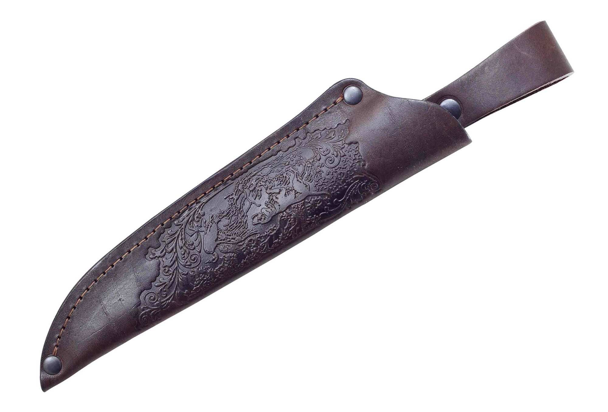 Рукоять ножа имеет удобную эргономическую форму, и выполнена из наборной натуральной кожи. Преимущества такой рукояти неоспоримы в холодное время года - она не холодит руку и не скользит. Рукоять защищена от порчи или разрушения, латунным больстером и красивым деревянным навершием. В комплект поставки ножа входят поясные ножны из натуральной кожи высшего сорта.
