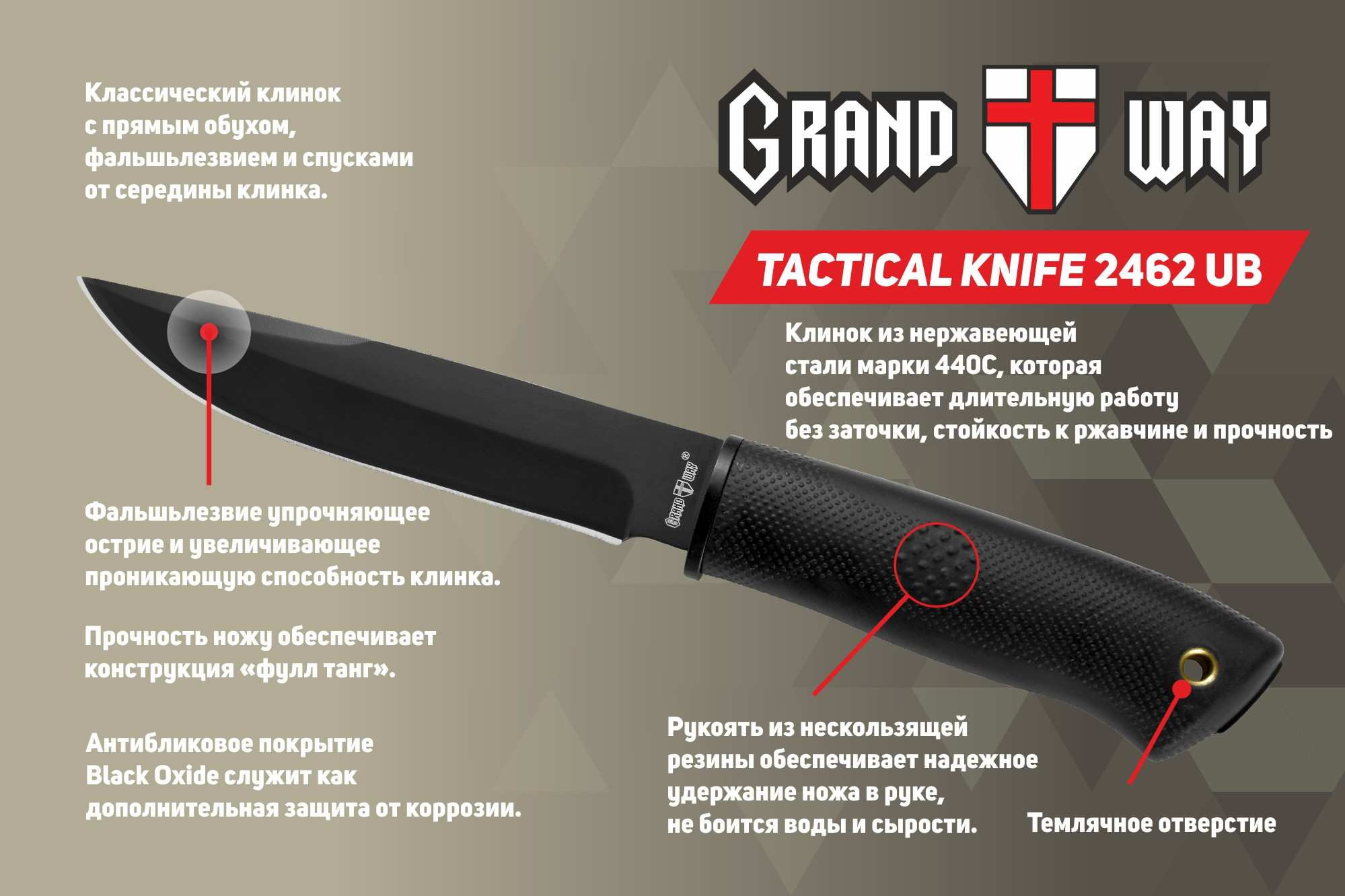 Продуманная геометрия клинка закаленного до 59 HRC сочетает универсальность, высокую прочность и хорошую резучесть. Прочность ножа обеспечивается конструкцией «фулл танг», при которой широкой хвостовик клинка полностью проходит сквозь рукоять и воспринимает на себя нагрузку. Сама рукоять изготовлена из нескользящей резины, не боится намокания и обеспечивает надежное удержание ножа в руке. В навершии рукояти имеется отверстие для темляка. Нож оснащается ножнами открытого типа из нейлона «кордура» с непрорезаемой вставкой.