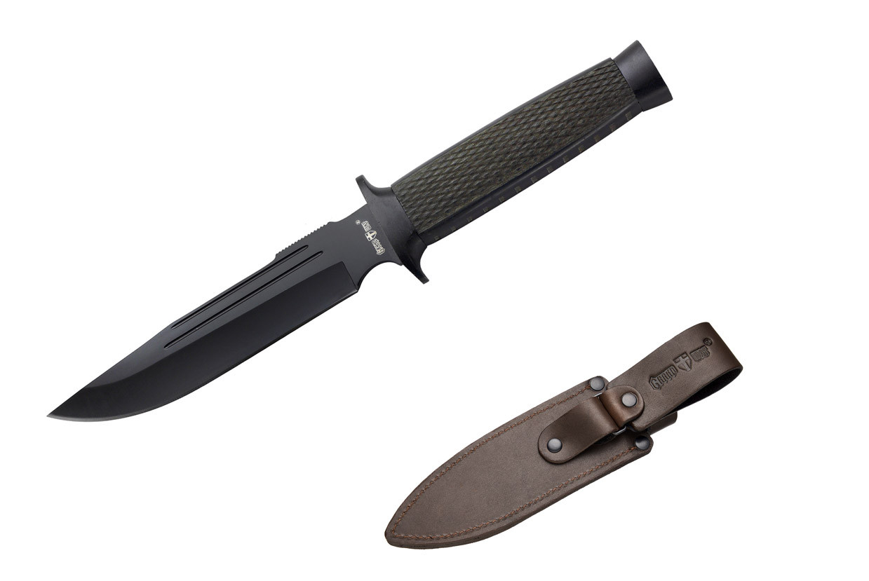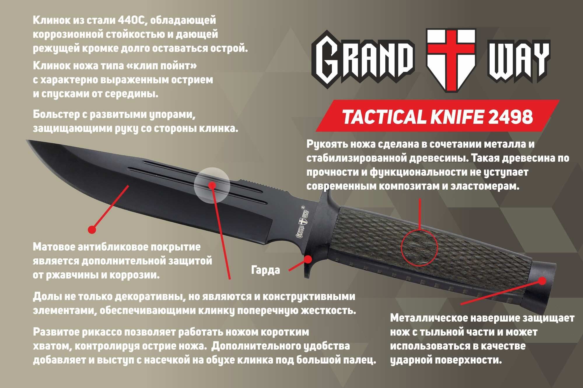 Клинок ножа - типа «клип - пойнт» со спусками от середины. Характерное отличие таких клинков – более ярко выраженное острие. Матовое антибликовое покрытие не только дизайн – фишка, но и дополнительная защита от коррозии. Два дола на клинке это не только и не столько дань дизайну и развитию агрессивного внешнего вида, сколько конструктивный элемент, обеспечивающий поперечную жесткость клинка толщиной 2.3 мм. Сталь 440С используемая на клинке, уже почти пол - века является оптимальной для производства ножевых изделий по соотношению цена – качество. В явных плюсах этого материала высокая коррозионная стойкость и способность длительное время сохранять свойства режущей кромки без периодической заточки.