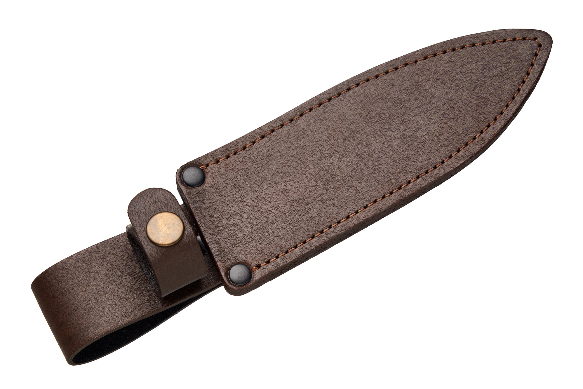 Мелкая насечка нанесенная на рукоять добавляет ей фрикционных свойств и очень здорово выглядит! Для предотвращения разрушения деревянной части рукояти, в процессе эксплуатации ножа, она защищена с торца металлическим тыльником, который может быть использован в качестве ударной поверхности. Со стороны клинка рукоять защищена больстером с развитыми упорами, которые, по сути, превращают больстер в довольно эффективную гарду.