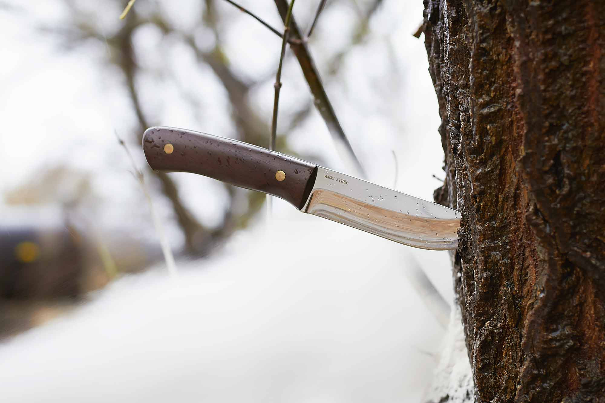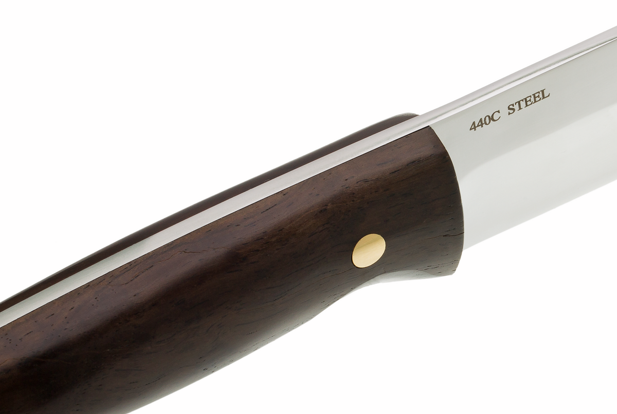 Клинок и хвостовик ножа изготовлены из единой полосы стали. Такая конструктивная особенность обеспечивает ножу великолепные прочностные характеристики. Сталь 440С, из которой изготовлен клинок, уже примерно 40 лет является "классической" в производстве ножей и сохраняет за собой звание одной из самых популярных ножевых сталей. 440C обладает довольно высокими механическими и технологическими свойствами, и является прекрасным выбором для универсального или охотничьего ножа. Основными преимуществами данной стали являются удачное сочетание стойкости режущей кромки, коррозионной стойкости и прекрасной прочности. Клинок имеет утилитарную, пригодную на все случаи жизни каплевидную форму. Такая форма - это золотая середина, разумный баланс между прочностью, удобством работы и проникающей способностью, которая в рабочем ноже не имеет решающего значения. Рукоять образована накладками из темного палисандра.