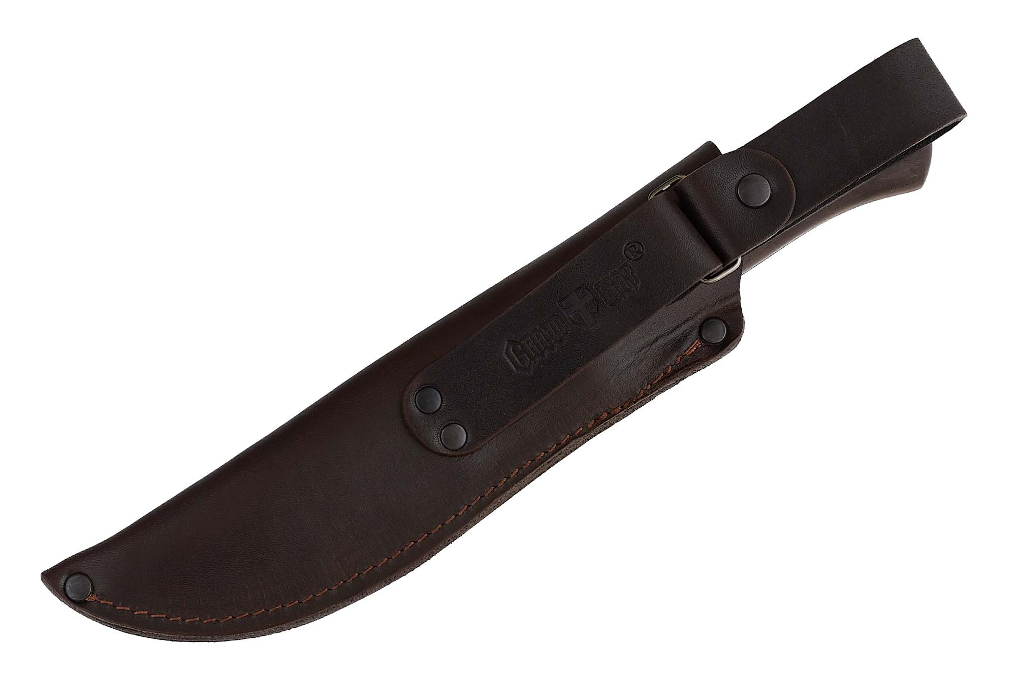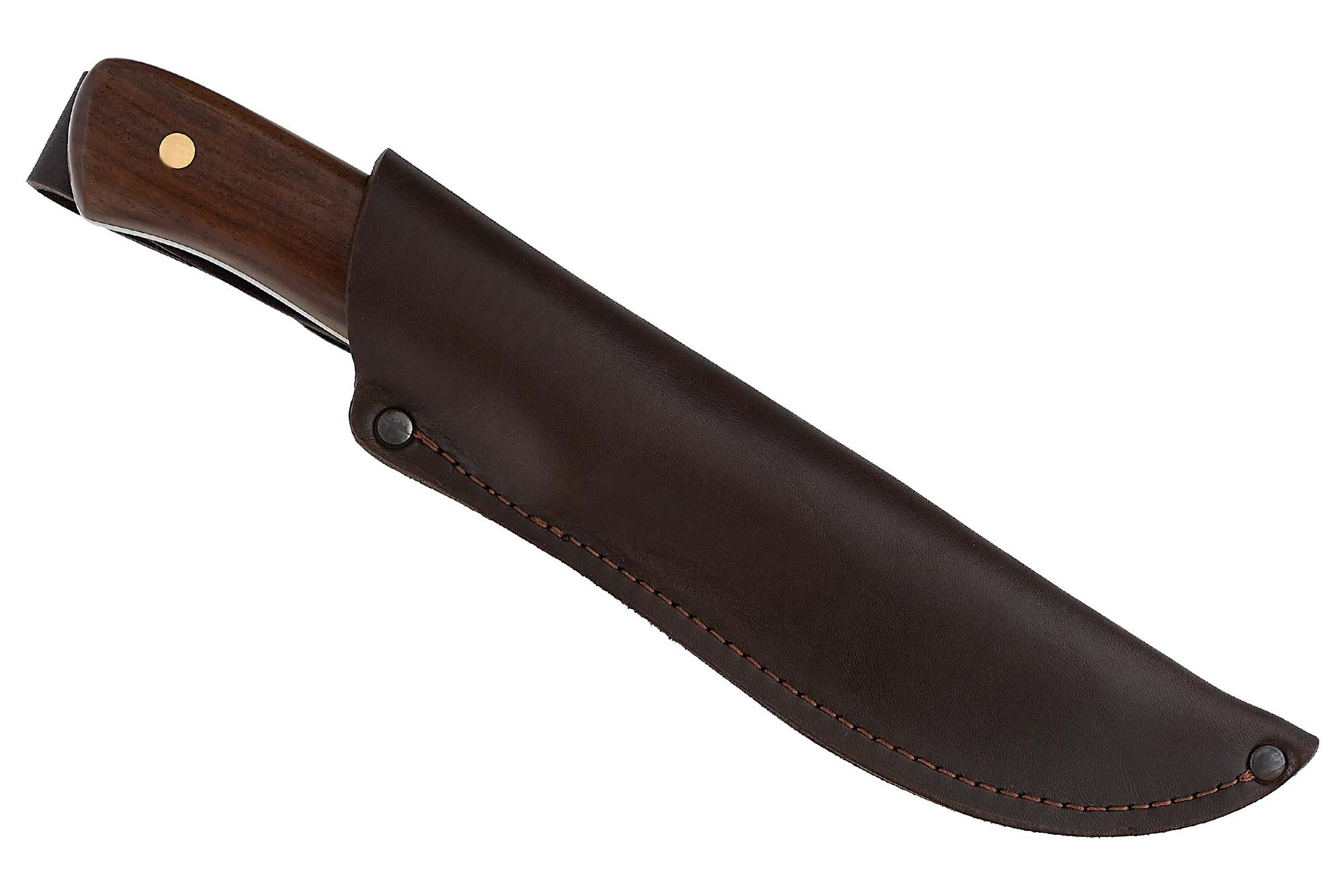 Рукоять имеет простую форму, овальное сечение и прекрасную ухватистость. Такая рукоять не только красива, у нее есть еще одно преимущество - зимой она не холодит руку. Для производства рукоятей ножей, палисандр применяется относительно не давно, но из-за своих декоративных и физических свойств быстро приобрёл популярность среди любителей клинкового оружия. Древесина рукояти обработана гидрофобизаторами и антисептиками, что делает ее устойчивой к воздействию влаги и вредителей. В комплект поставки ножа входят поясные ножны из натуральной кожи высшего сорта.