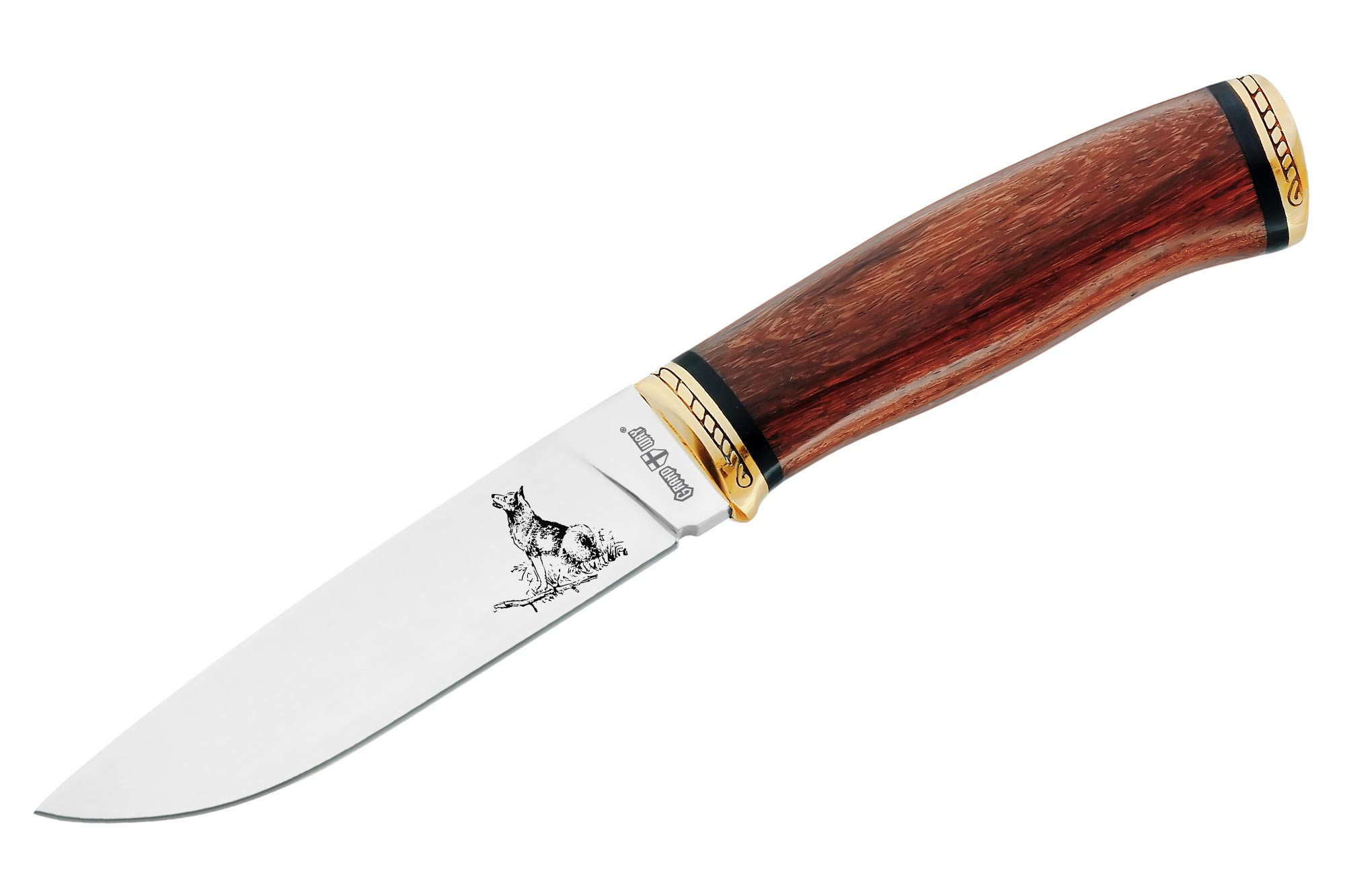 Форма клинка – зі зниженням лінії обуху, одна з найвдаліших і тому найпоширеніших серед мисливських та туристичних ножів. Що й не дивно, оскільки така форма містить у собі оптимальне співвідношення ріжучих та колючих властивостей, що, в цілому, забезпечує ножу з таким лезом, звісну універсальність та високі експлуатаційні якості.