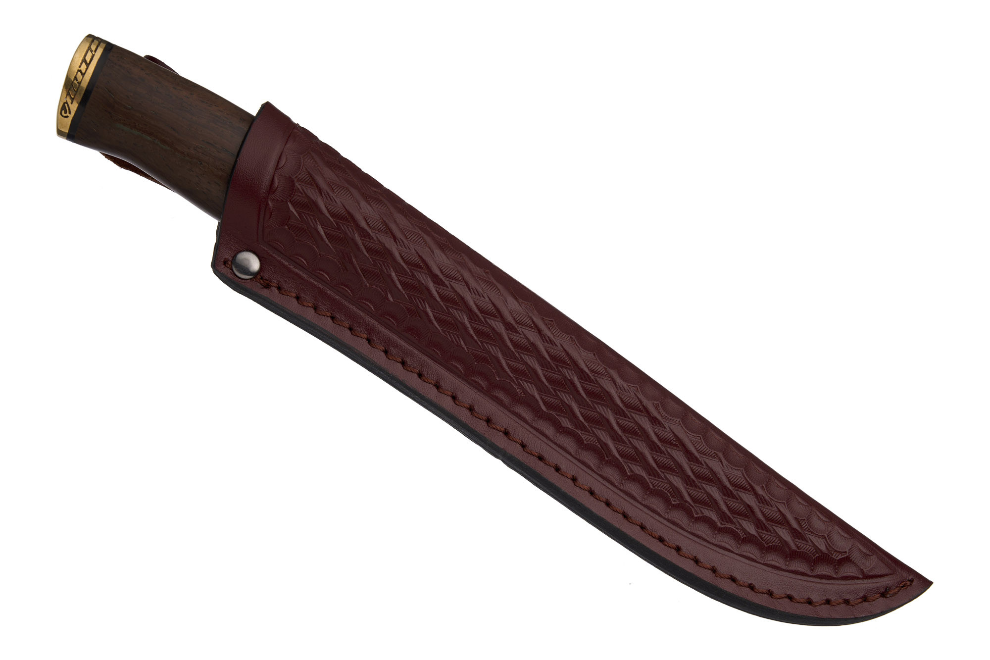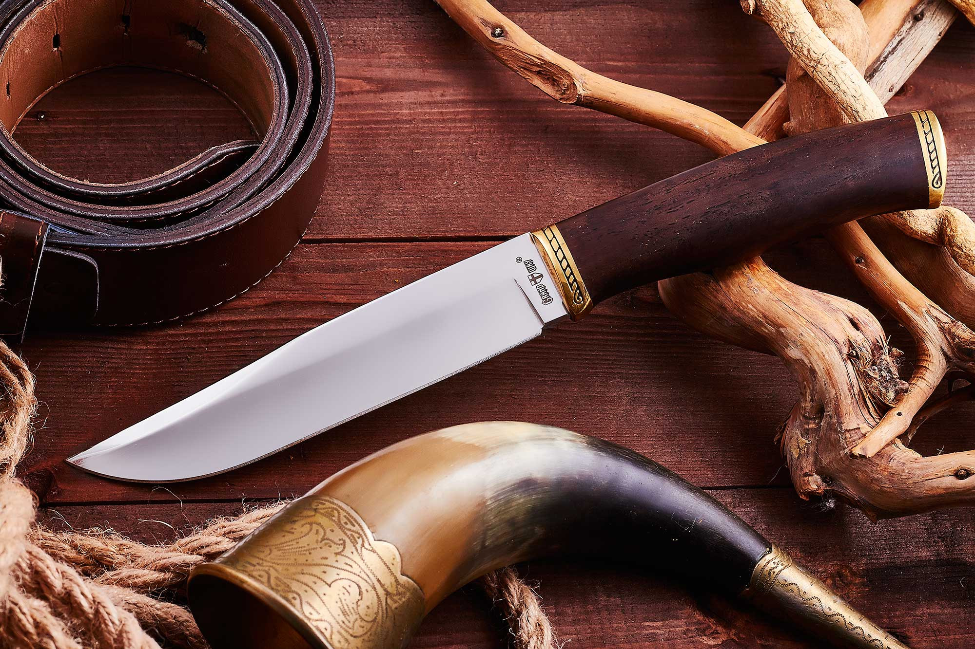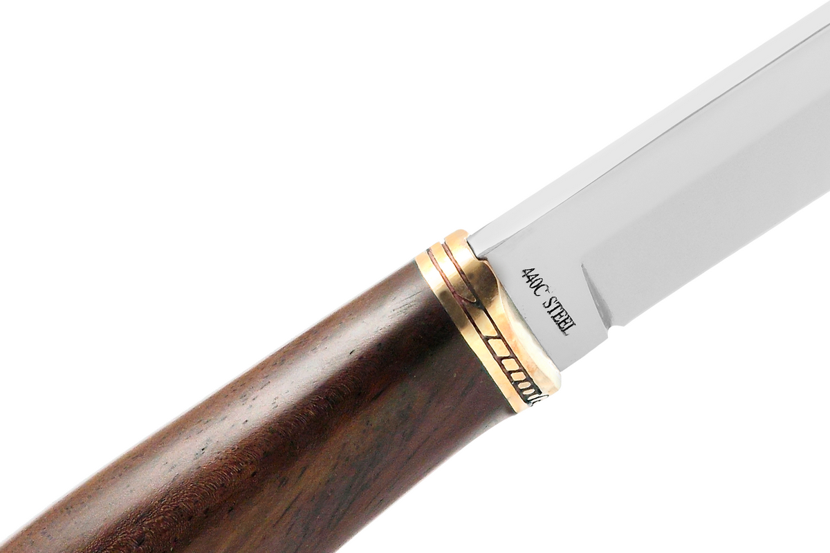 Вдале поєднання дзеркального полірування сталі, теплих тонів дерева та латунних елементів дозволило створити реально привабливий образ класичного фіксованого ножа.