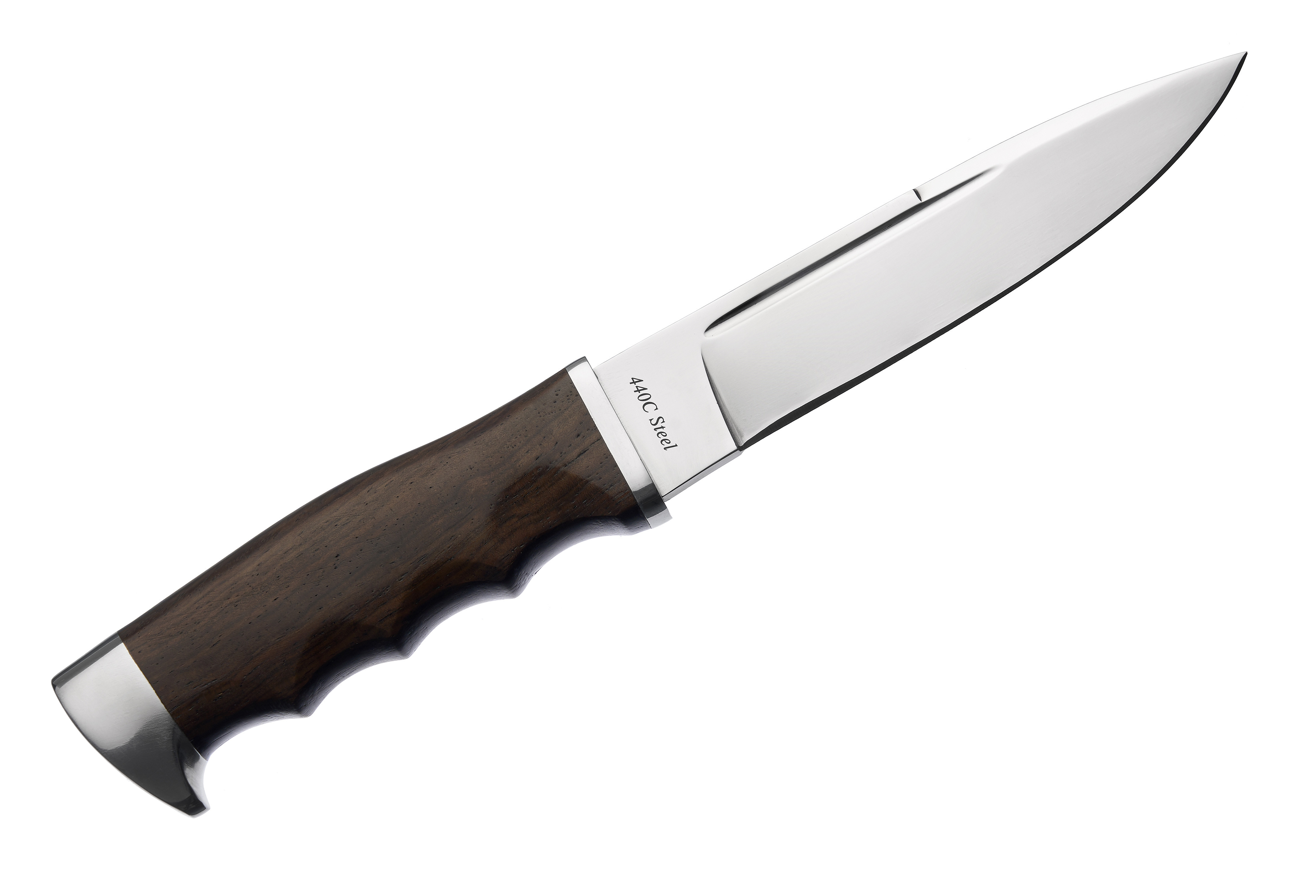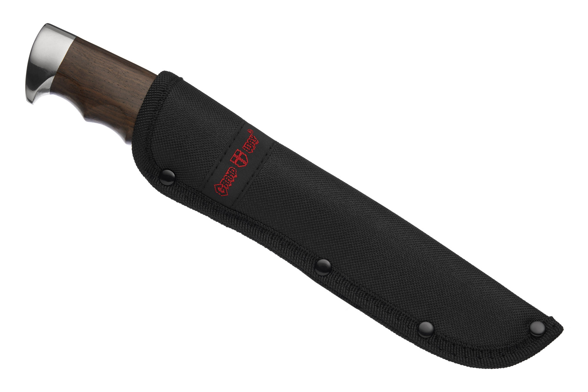 Руків'я виконане з красивої полірованої деревини, має сталевий больстер, що захищає деревину від пошкоджень під час роботи та заточування, та масивгне металеве навершя, яке варте окремої розмови. На жаль це не фултанг і ми не можемо бачити хвостовик ножа, але шляпка крепіжної гайки запевнює нас, що там, в глибині конструкції хвостовик переходить у наскрізну шпильку з різбою. Що ж, якщо це дійсно так, то це доволі непогано і є відомим компромісом між міцністю, вагою, та уявами про естетику мисливського ножа (зовнішній вигляд фултангів подобається не усім).