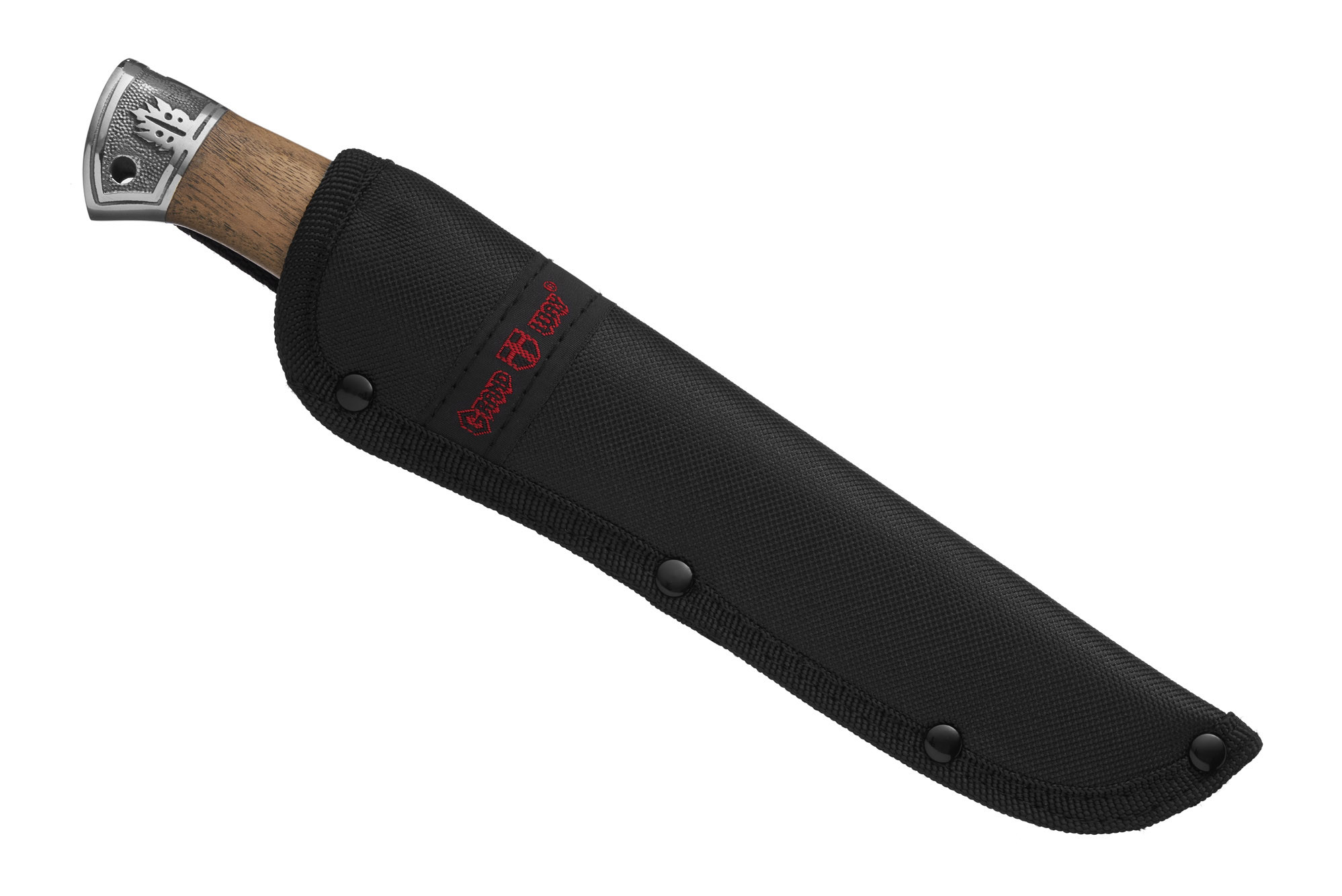 Руків'я виготовлене у традиційному для європейських мисливських ножів стилі – всадна конструкція, у якій хвостовик-шпилька йде на всю довжину до навершя, де фіксується декоротивною гайкою.