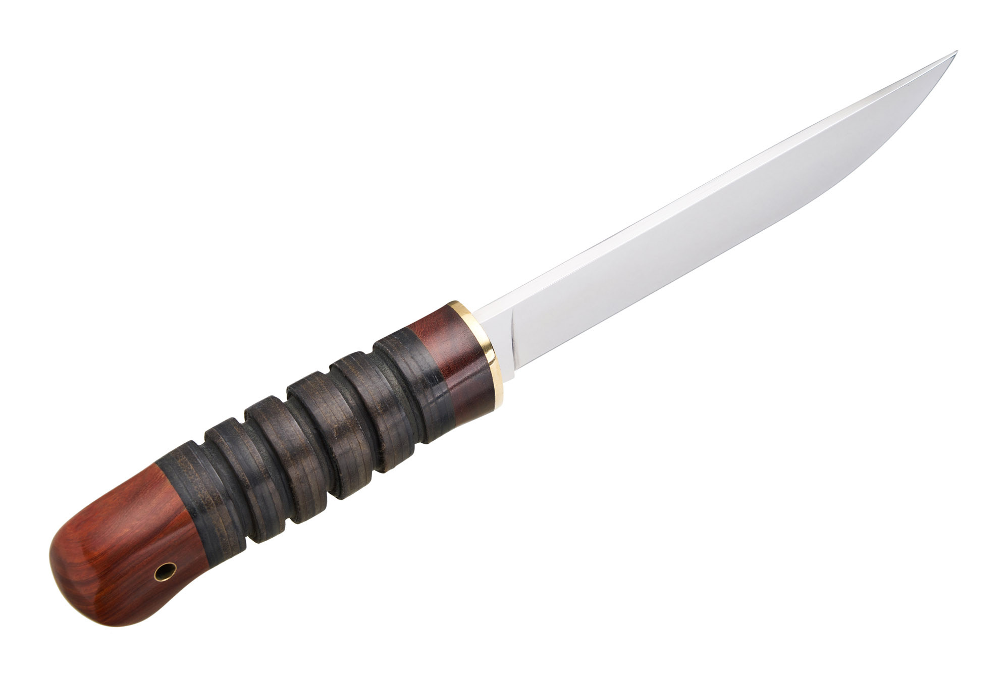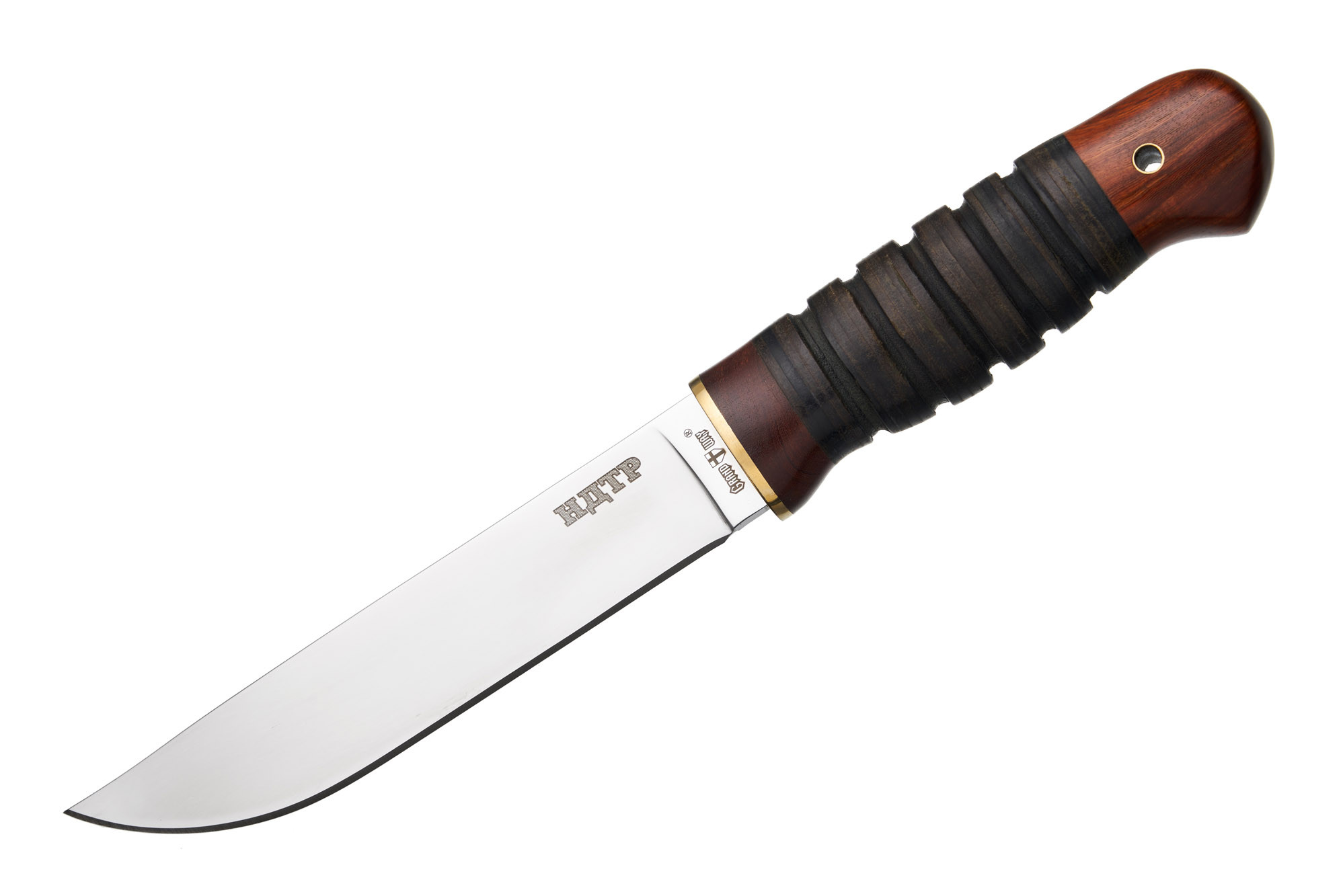 Руків'я ножа виготовлене з дерева та набірної шкіри. Воно в міру масивне, добре заповнює долоню. Завдяки овальному перерізу рукоятка не буде провертатись в руці під час роботи. Ребра в центральній (набірній) частині руків'я ще більше підвищують надійність хвату. У навершії є темлячний отвір. Ы саме для такого ножа темляк точно зайвим не буде.
