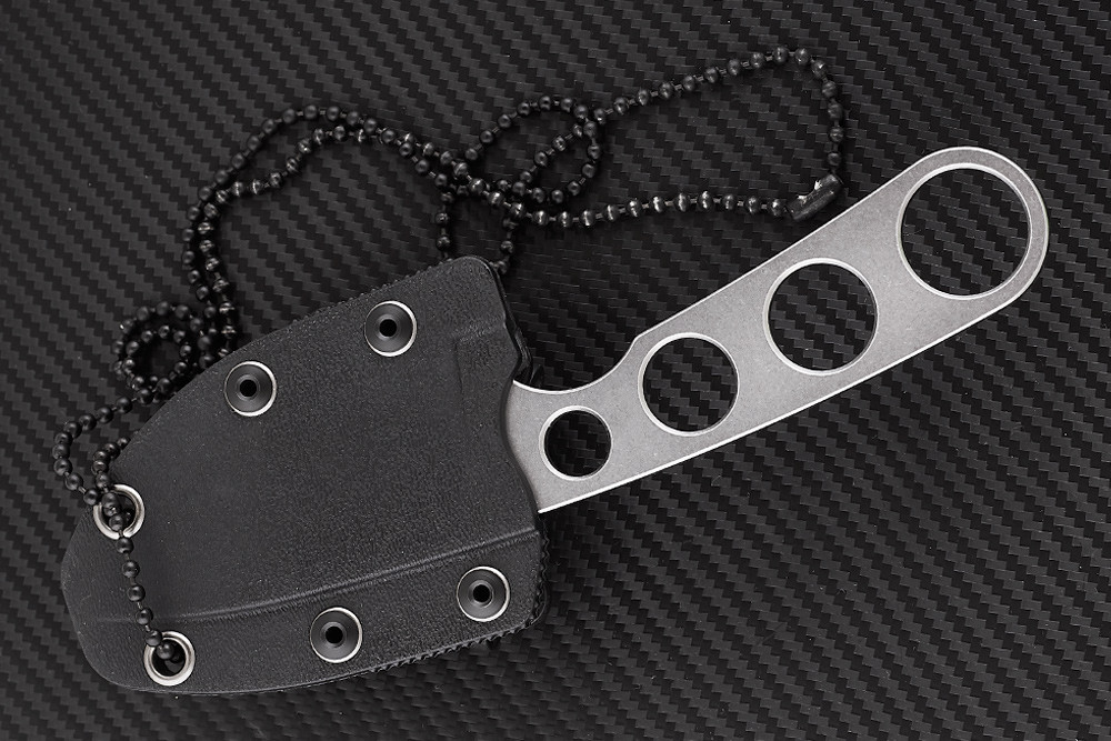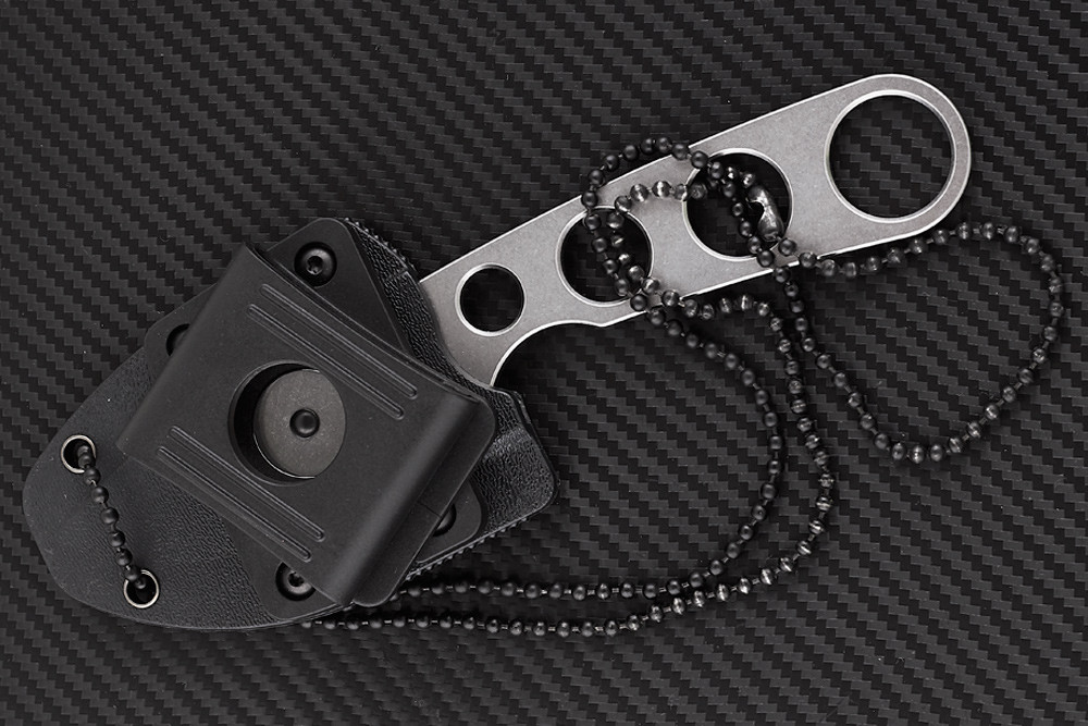 В комплекте с ножом идут ножны с регулируемой поясной клипсой и цепочка. То есть, нож можно носить и на шее и на ремне, по желанию. В шейном варианте клипса снимается, и ножны становятся очень плоскими и чуть ли не невесомыми. Клипса позволяет регулировать угол крепления ножен к поясу. Достаточно нажать небольшой стальной язычок, отжимающий фиксатор, и провернуть крепление в искомое положение.