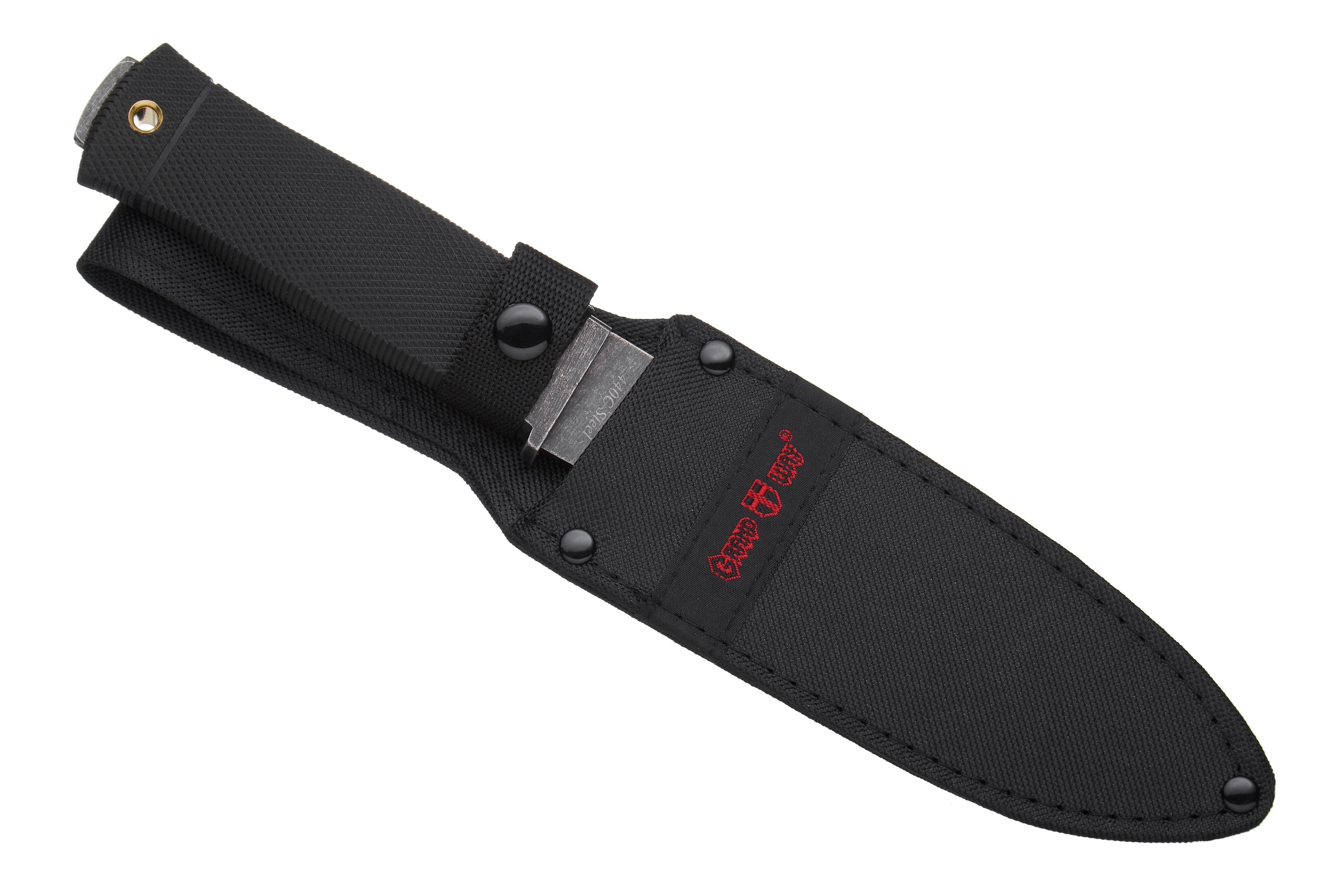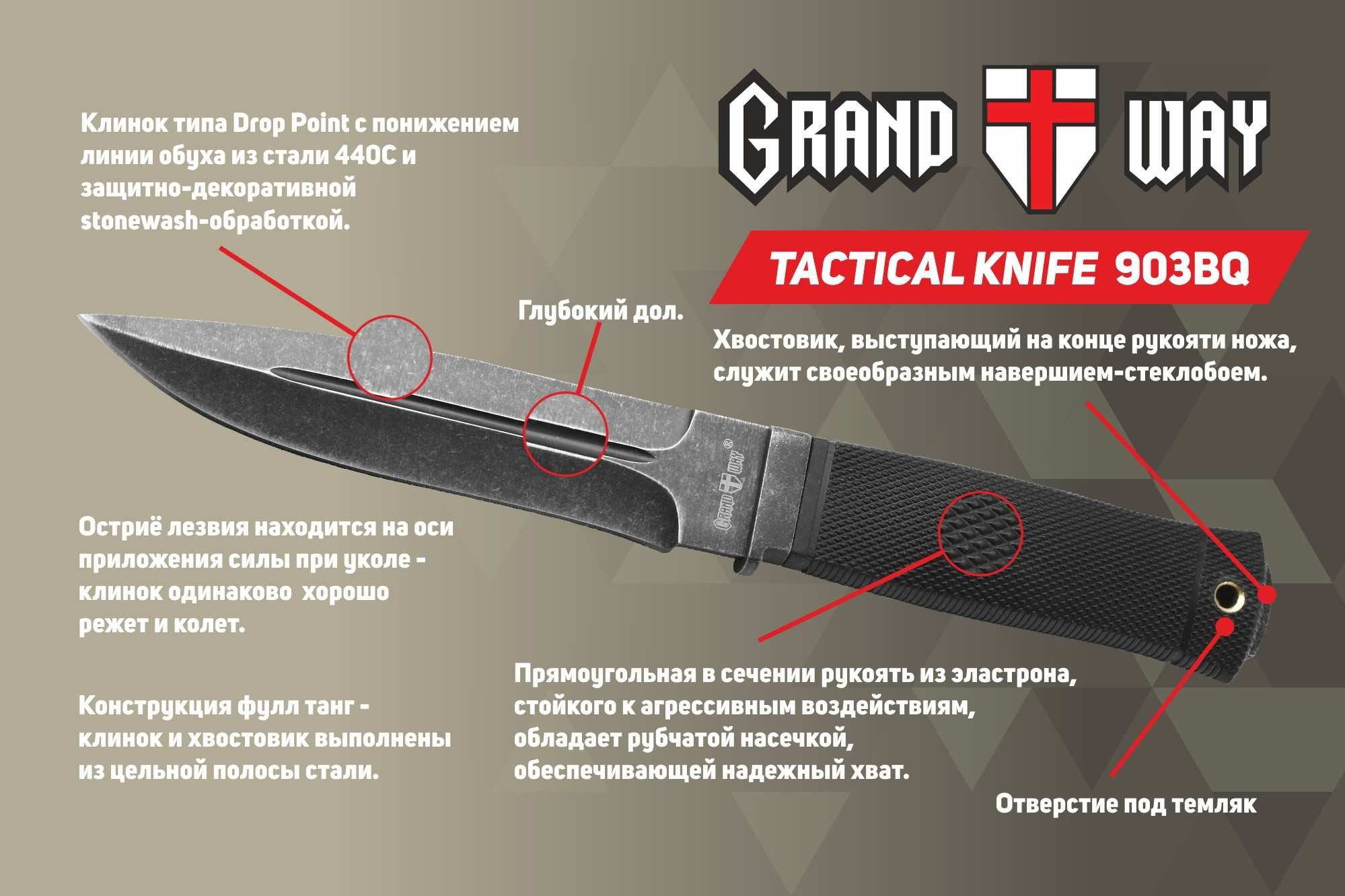 Нож оснащен довольно крупным и мощным клинком типа Drop Point c понижением линии обуха. Остриё лезвия находится на оси приложения силы при уколе, такой клинок одинаково хорошо режет и колет. Клинок имеет фальшлезви на обухе, которое образованно спусками без заточки. Фальшлезвие помогает клинку при уколе входить в разрезаемый материал. Толщина клинка в 5 мм, центральные долы, предназначенные для увеличения прочности клинка – все это говорит о том, что при проектировании ножа учитывались будущие нелегкие условия эксплуатации. Феноменальная прочность ножа обеспечивается тем, что лезвие и хвостовик выполнены из единой полосы стали. Лезвие ножа изготовлено из стали 440С, очень популярного и достойного ножевого материала. 440С - довольно твердая сталь, ножи из нее отлично режут и долго не тупятся. Клинок ножа имеет черное антибликовое покрытие, которое помимо своего основного предназначения — не создавать отблесков, будет служить дополнительной защитой от коррозии.