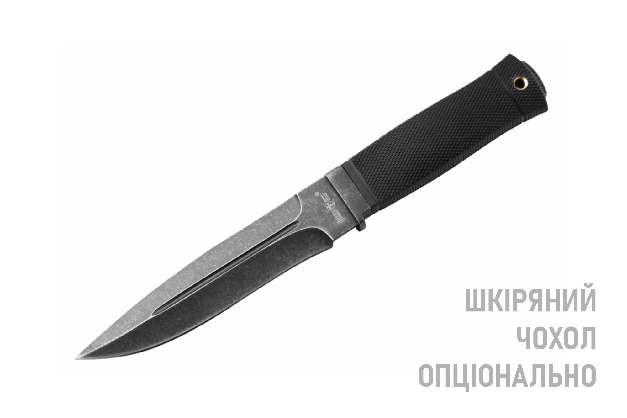 Рукоять ножа имеет прямоугольное сечение и выполнена из современных синтетических материалов, стойких к агрессивным средам. «Шершавая» и мягкая структура рукояти обеспечит надежное сцепление с рукой. В рукояти предусмотрено отверстие под темляк. Наличие темляка (веревочная или ременная петля) в ножах с рукояткой без ограничителя защитит пальцы руки от соскальзывания на лезвие клинка. Кроме этого темляк позволяет высвободить пальцы руки для выполнения какой-либо работы, не выпуская нож из руки. На конце рукояти имеется металлическое навершие. В комплект поставки ножа входят поясные ножны из качественной натуральной кожи высшего сорта. Кожаный чехол предлагается опционально, узнавайте о наличии данной опции дополнительно.