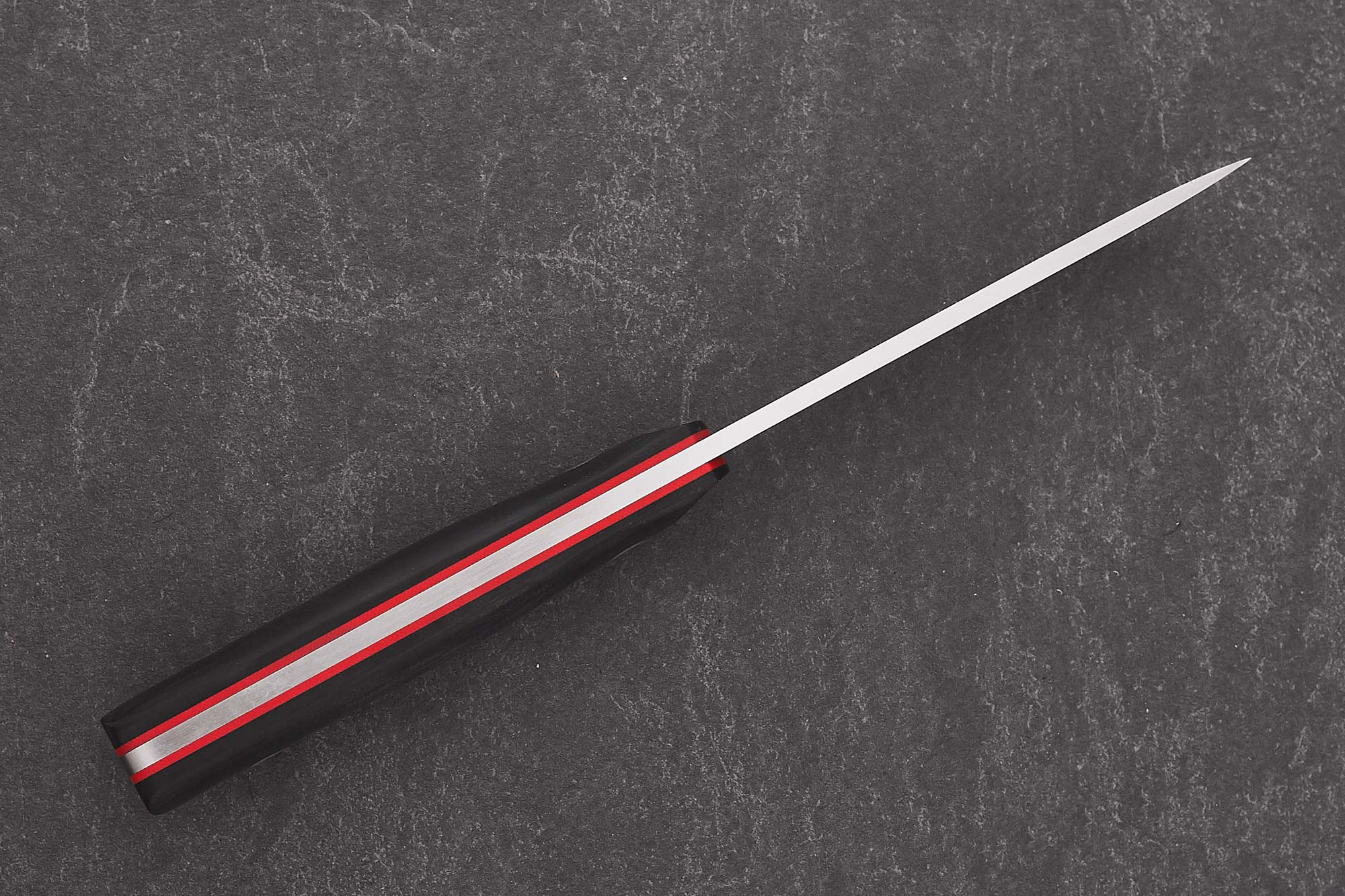 Изготовлен клинок из «инструменталки» D2. Эта сталь широко применяется в ножевой индустрии. Из неё получаются клинки с отличным резом и долго сохраняющейся остротой заточки.