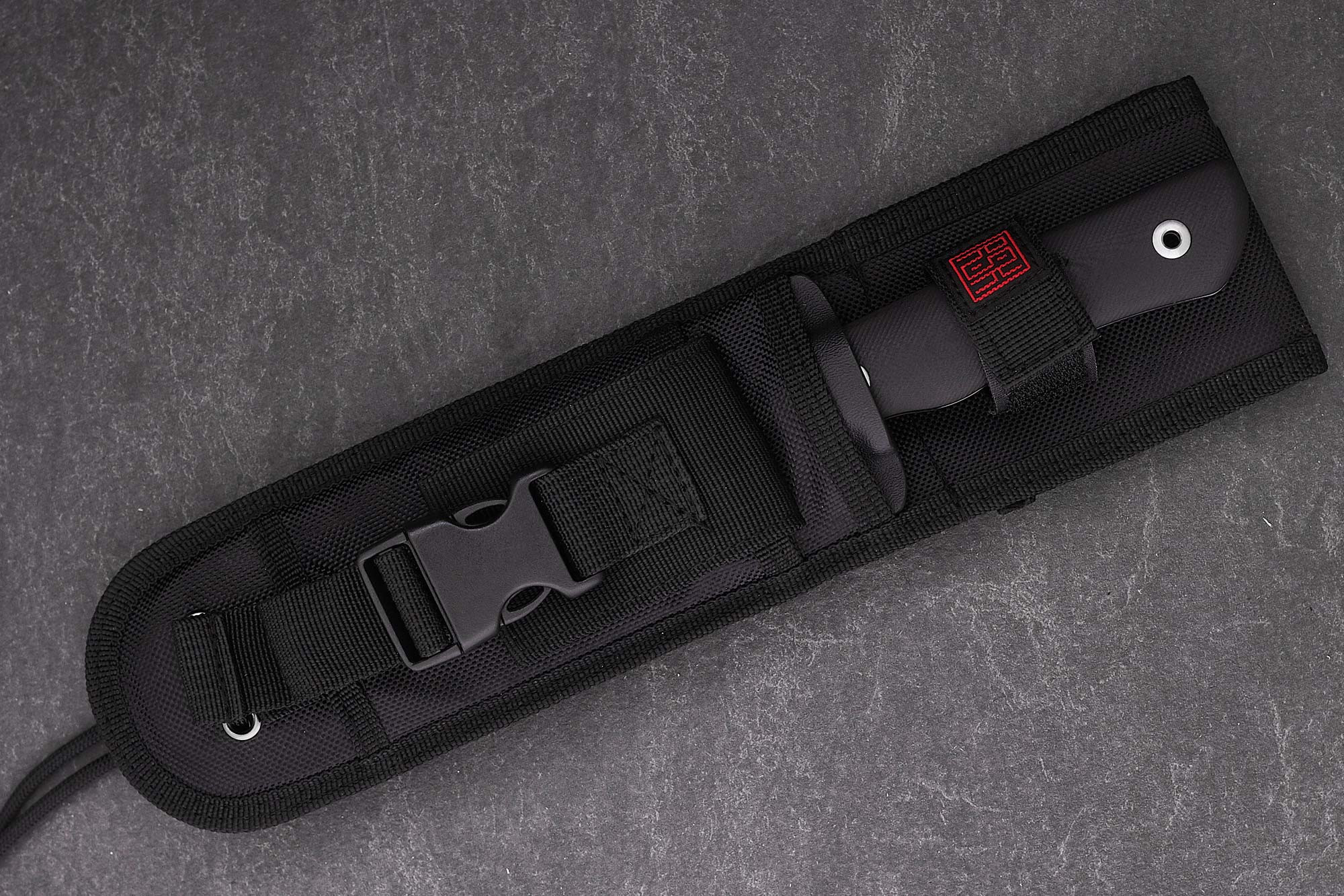 Ножны, современные, кайдексные, установленные в регулируемый чехол из кордуры. Нож сидит в ножнах плотно и не выпадает даже в перевёрнутом положении.