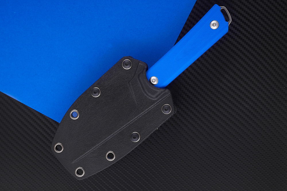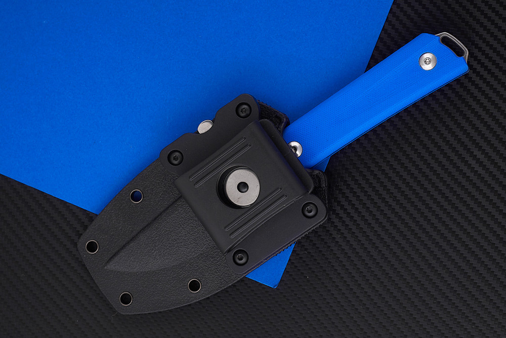 Сама рукоять конструктивно является фултангом. Накладки сделаны из G10 и крепко притянуты к хвостовику торксами. В навершии расположено кольцо для крепления темляка.