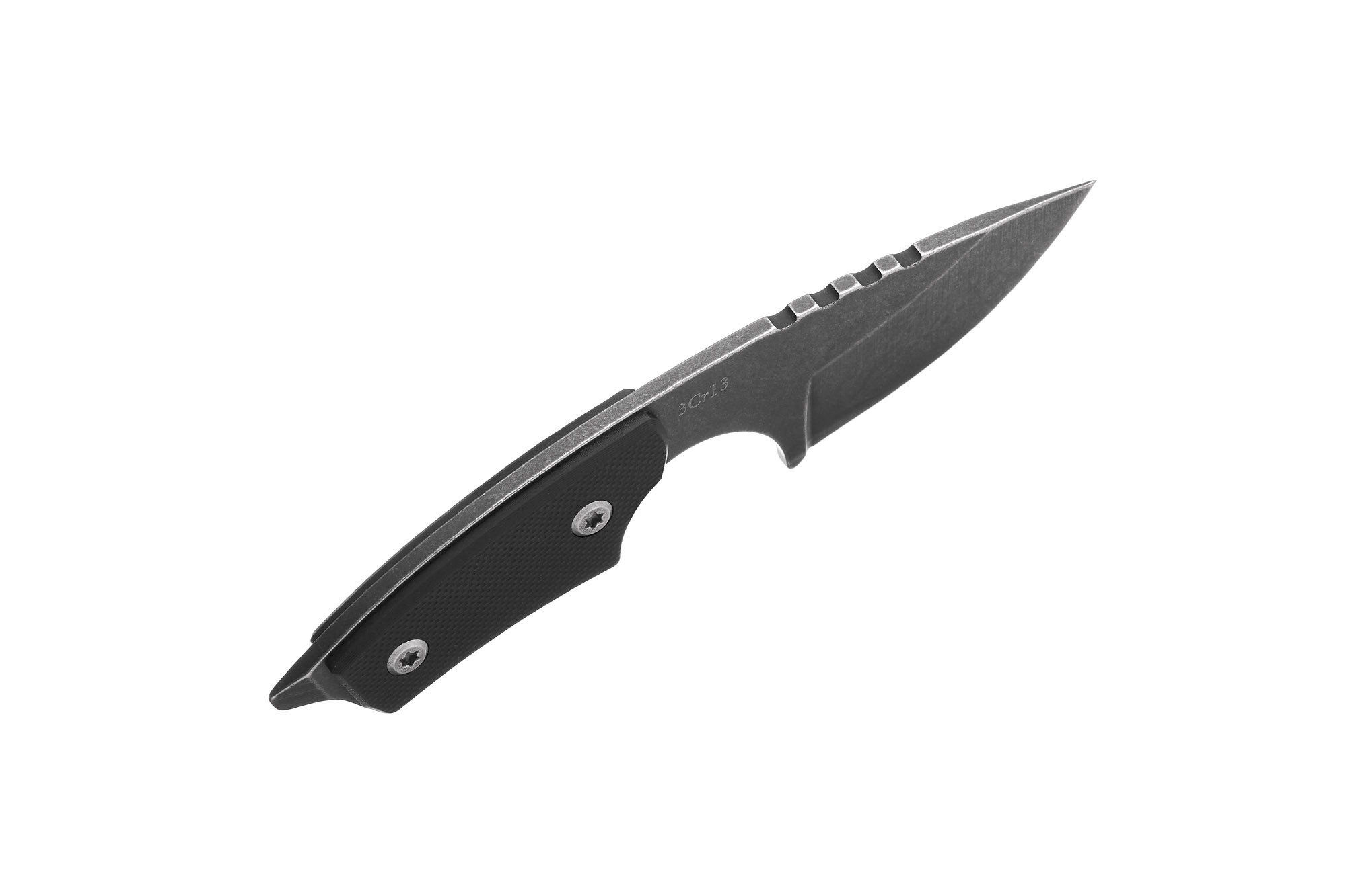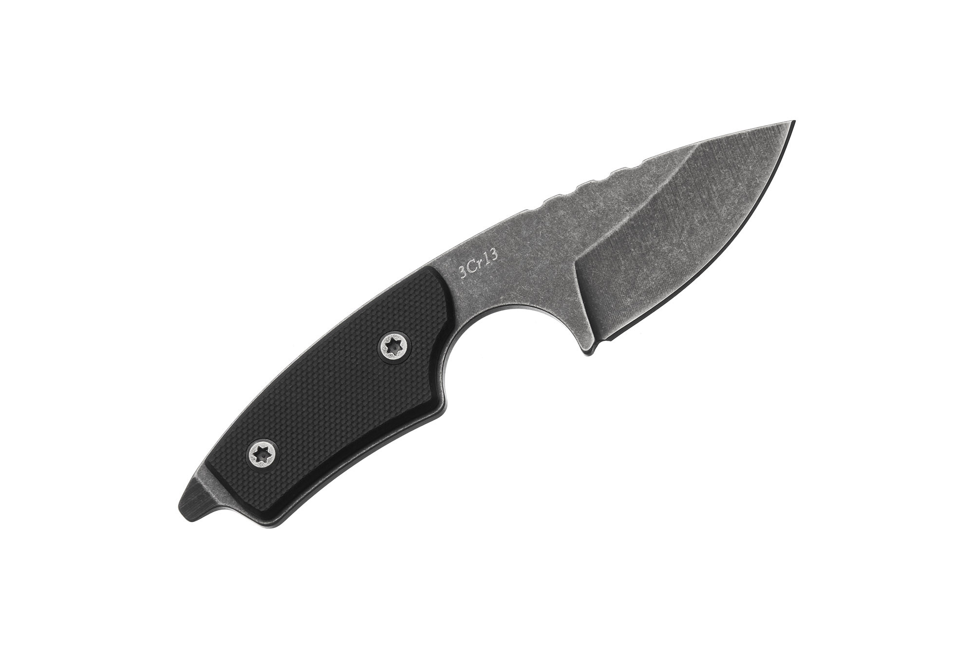 Grand Way WK 19069 — фіксований шийний ніж з клинком форми drop point зі сталі 3Cr13 і покриттям Black Stonewash. Ніж поєднує в собі універсальність та сучасний зовнішній вигляд. Додаткова насічка на обусі дозволяє надійно впертись великим пальцем під час роботи. На тильній частині руків'я передбачено функціональний ударний елемент.