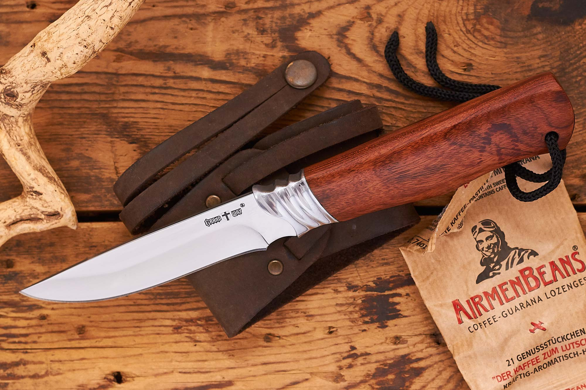 Рукоять данной модели имеет сквозную конструкцию. При этом хвостовик клинка фиксируется специальным резьбовым соединением в районе навершия "на гайку". Как несложно догадаться, нож с таким способом монтажа рукояти будет прочным, приспособленным к нагрузкам.